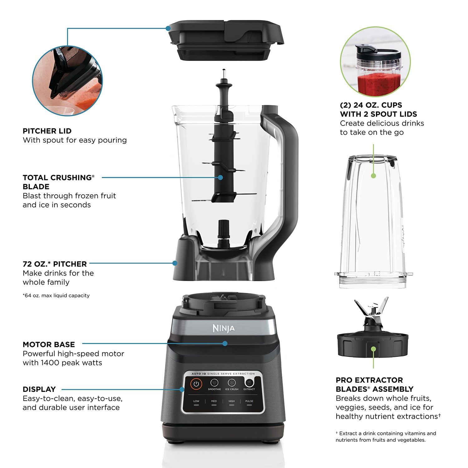 Includes a 1400-Peak-Watt Motor Base, a 72-oz. Total Crushing Pitcher & Lid, two 24-oz. Single-Serve Cups & Lids, a Stacked Blade Assembly, and a Pro Extractor Blades Assembly