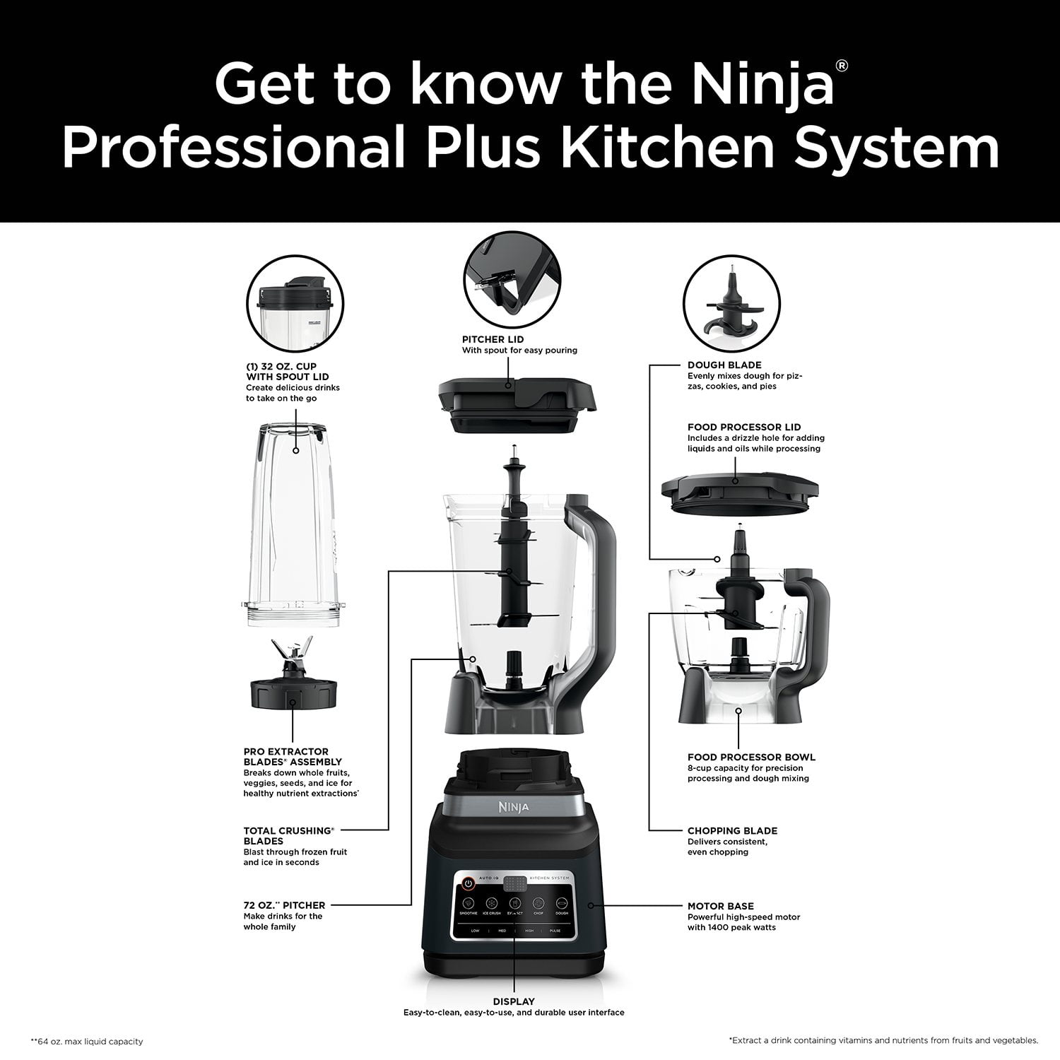 Includes: 1400-Peak-Watt Motor Base, 72-oz.** Total Crushing® Pitcher, (2) 32-oz. Single-Serve Cups with Spout Lids, Pro Extractor Blades Assembly, 8-Cup Precision Processor® Bowl, Stacked Blade Assembly, Chopping Blade Assembly, Dough Blade Assembly, 30-Recipe Inspiration Guide, and Instruction Booklet
