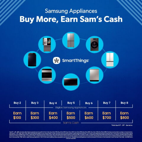 • Buy 7 select Samsung appliances, earn $700 Sam’s Cash