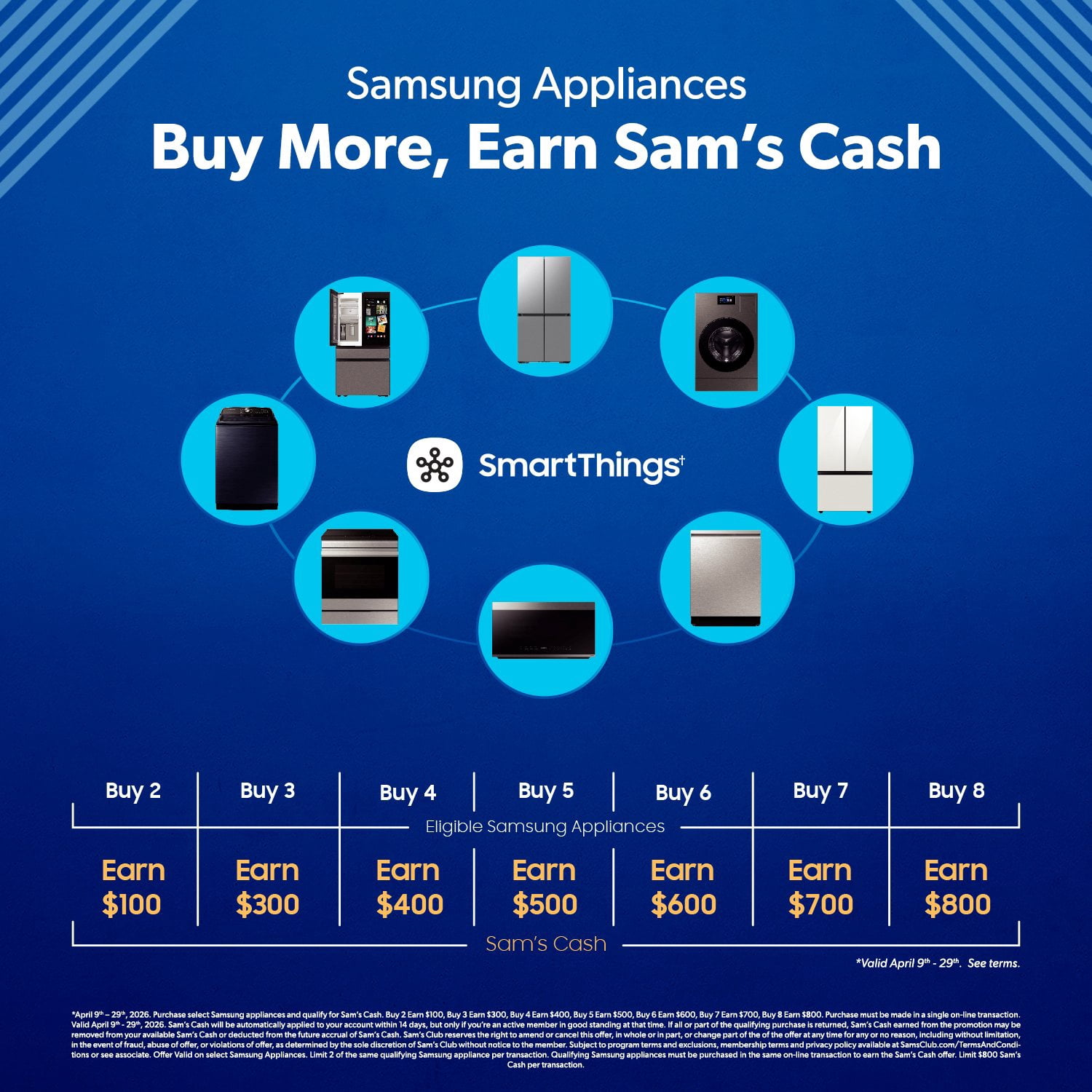 Purchase select Samsung appliances and qualify for Sam’s Cash. See full assortment of eligible items here.