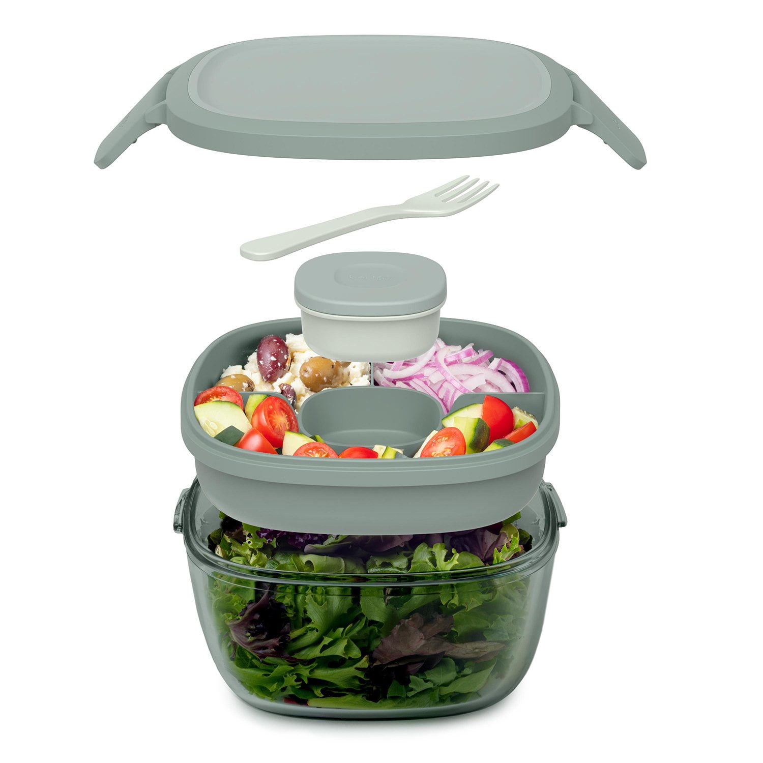 This all-in-one container is equipped with a removable tray for toppings and a 3-ounce container to keep your dressing separate until mealtime. The airtight, leak-proof lid ensures mess-free storage, allowing you to prep meals in advance and carry them in a lunch bag, backpack, or tote without worry. The reusable fork conveniently stores inside the lid, making it easy to enjoy your meal anytime, anywhere.