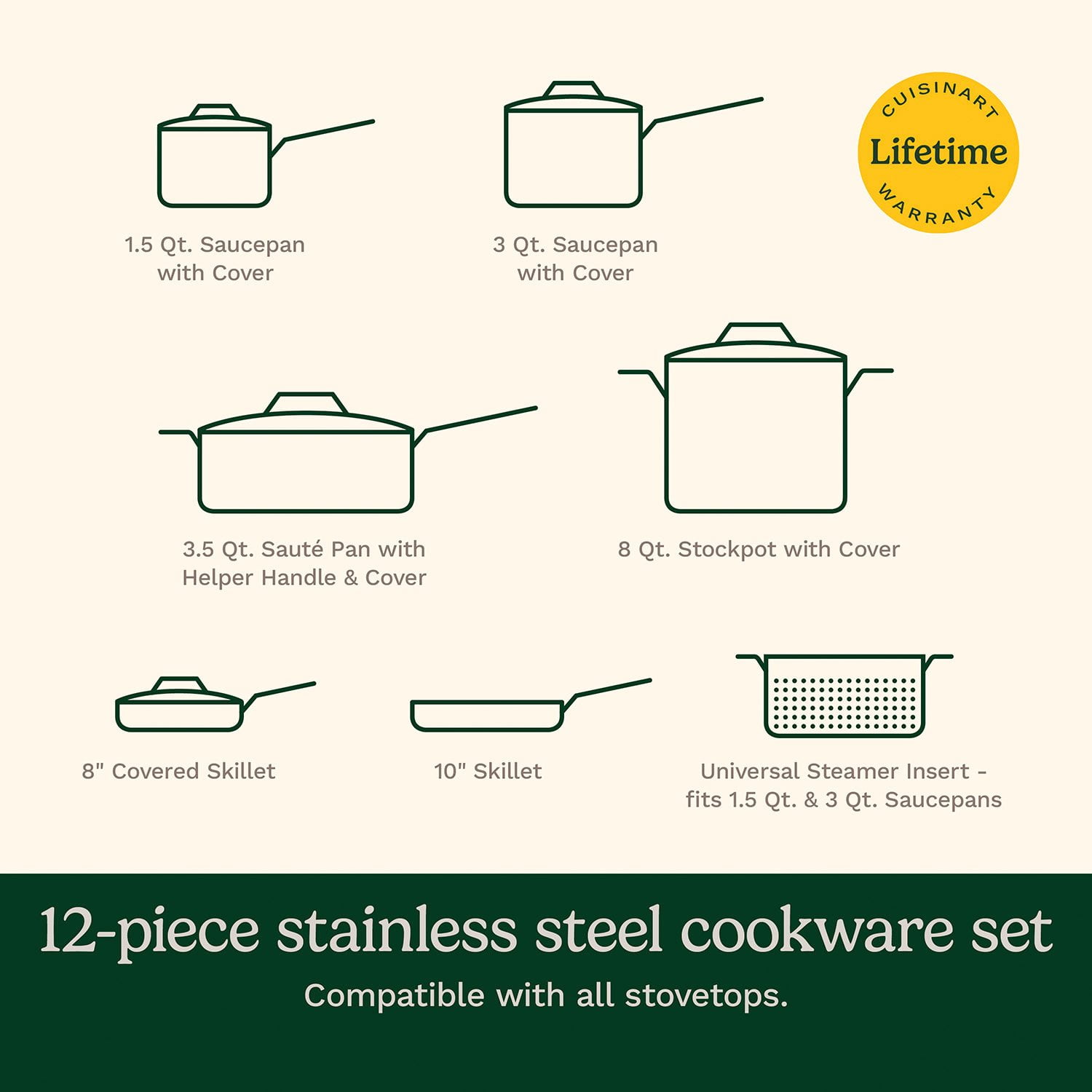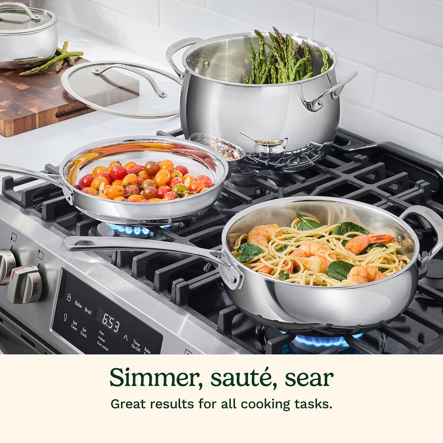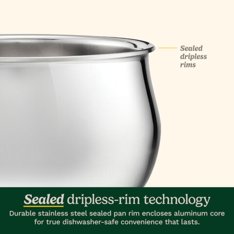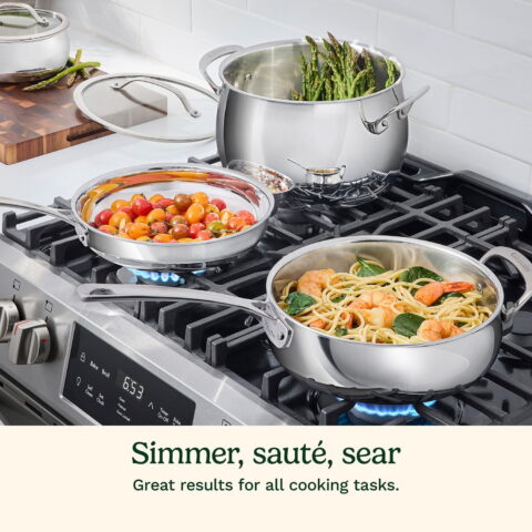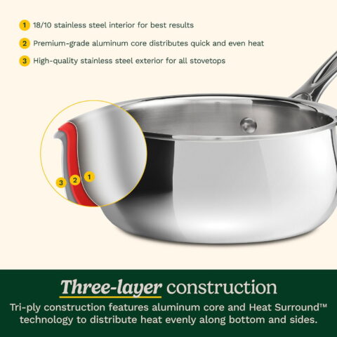 Crafted for both beauty and performance, Cuisinart’s PureClad™ Triple-Ply 12-Piece Stainless Steel cookware blends elegance with professional-grade quality. The luxurious, rounded full-body design enhances any kitchen, while the triple-ply stainless steel construction ensures durability and timeless appeal. Experience precise and even heat distribution with Heat Surround™ technology, where an aluminum core extends from the pan’s base up the sidewalls for flawless cooking results. Stay in control with cast stainless steel Cool Grip™ handles that remain cool to the touch, offering comfort and security. The tempered glass lids, framed with sleek stainless steel and wide handles, lock in moisture and flavor. The sealed, dripless rims ensure effortless, mess-free pouring and make cleanup a breeze in the dishwasher. Compatible with all stovetops, including induction, and oven-safe up to 500°F (450°F for lids), this cookware is as versatile as it is timeless—ready to elevate every meal you make.