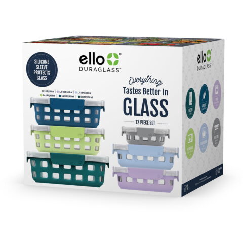 The Ello DuraGlass Artic Berry 12-piece Glass Food Storage Set includes 6 glass food storage containers with durable silicone protection, and 6 plastic leak-proof lids. This food storage set allows you to store food for a feast efficiently and easily. There’s a size for every food storage need: from large leftovers to fruit salad to snacks.