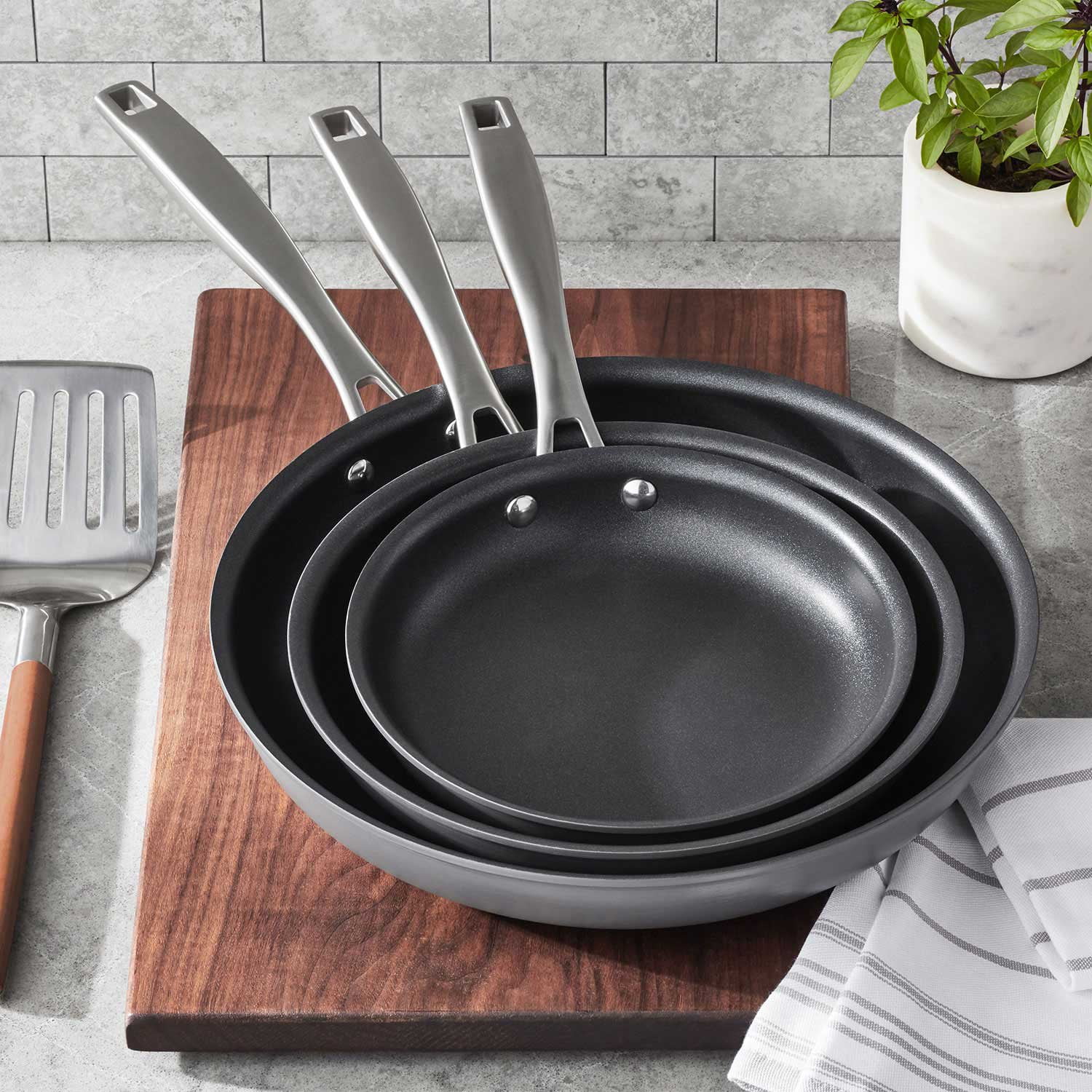 The Member’s Mark 3-Piece Hard Anodized Frypan Set is crafted from hard-anodized aluminum, a material renowned for its ability to distribute heat evenly and efficiently. This special treatment strengthens the metal, enhances its resistance to abrasion, and prevents chemicals from leaching into your food. These pans are designed to withstand everyday kitchen use, resist scratches, and are oven-safe up to 450°F (232°C), making them a versatile addition to your cookware collection.