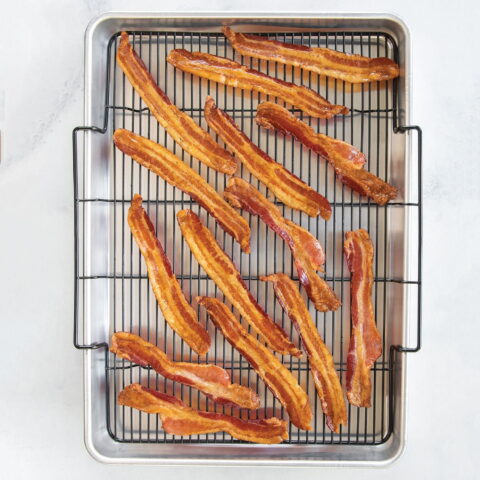 Ever tried making bacon in your oven instead of on the stove? You’re in for a surprise, and we predict it’ll be your favorite way to make it once you try it. This pan is ideally suited for this purpose and holds an entire package of bacon. Drippings collect beneath the rack and air circulates above and below the bacon, resulting in the most picture-perfect (and delicious!) bacon imaginable.