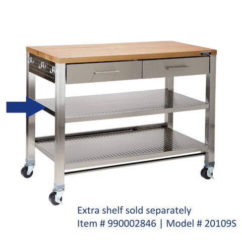 With an additional shelf, this Work Center Island Table can accommodate both large and small items. You can purchase an extra shelf if you wish to have 2 separate shelves on www.samsclub.com, item # 990002846 (Model # 20109S). Compatible leveling feet are also sold separately, item # 990012367| Model # WEB086.