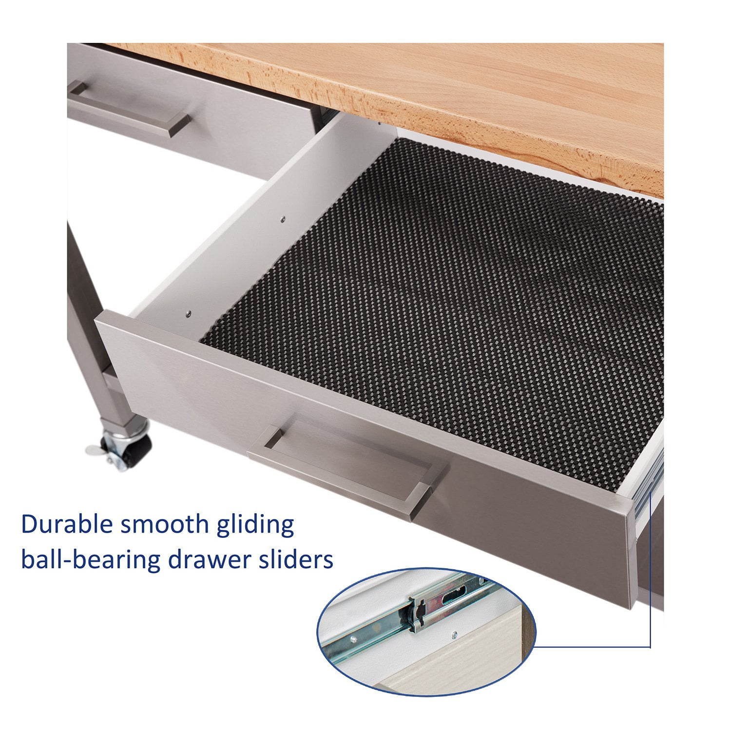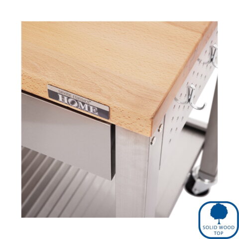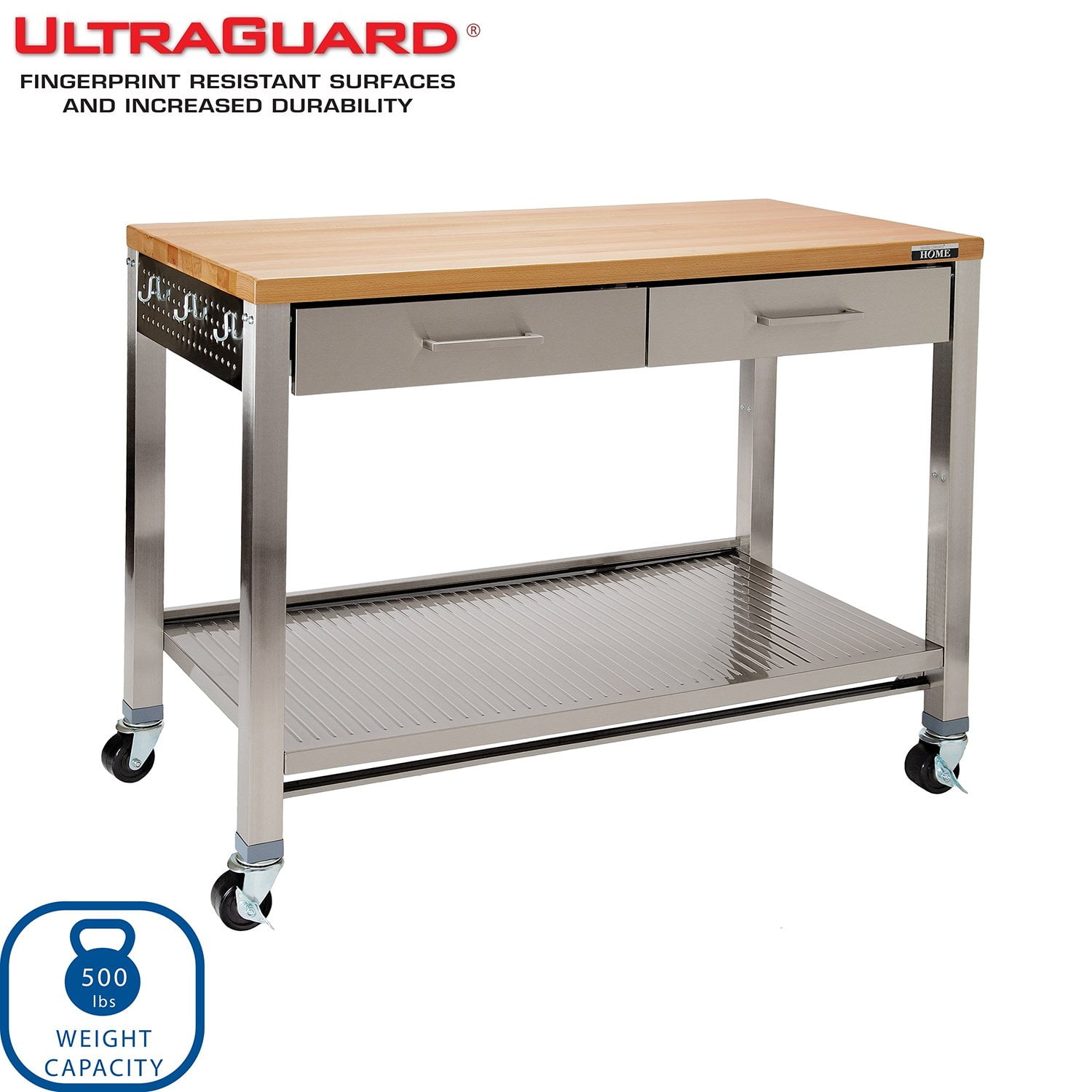 The Work Center Island Table is crafted with commercial-grade stainless steel with UltraGuard fingerprint-resistant coating to protect against fingerprints or smudges. The 1.5” thick table top is crafted from solid wood.