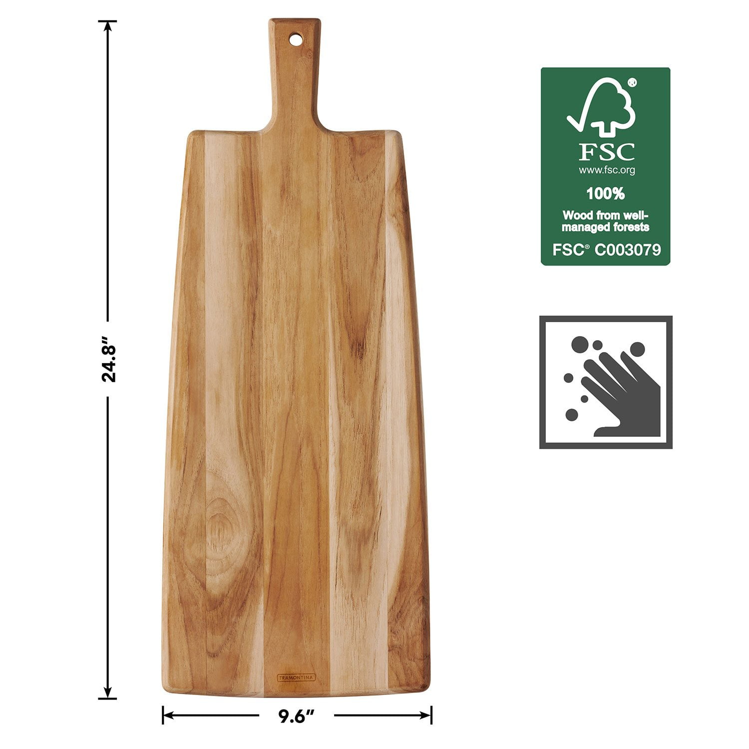 Crafted from durable, authentic Brazilian Teak wood harvested from FSC certified farmed forests in Brazil, you can enjoy the beauty of nature while knowing you’re making an eco-friendly choice. The cutting board sits steadily on any countertop, and its convenient handle allows you more maneuverability for serving.