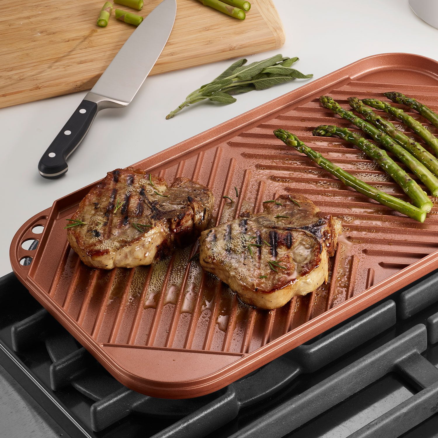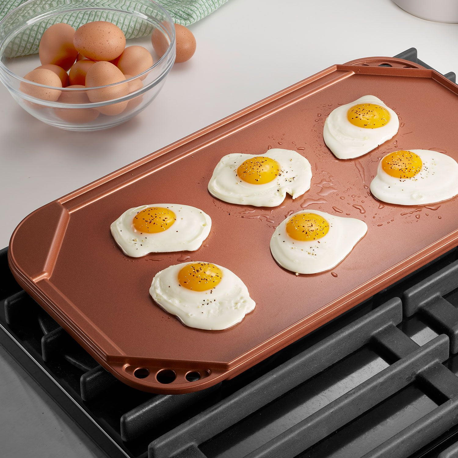 The Tramontina Double-Burner Grill/Griddle has a large nonstick cooking surface, which conveniently fits across two burners on a conventional cooktop, allowing you to prepare a wide range of recipes. The ridges on the grilling side help to create perfect sear marks on artisan sandwiches, meat, fish or poultry and lift your food, channeling away unwanted oils. The flat side is excellent for whipping up many breakfast dishes, like French toast, eggs, bacon or pancakes and could also be used to warm up hamburger buns or tortillas.
