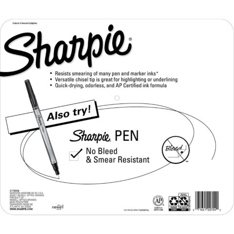 Sharpie Highlighters are especially perfect for all those left-handed highlight users out there! Sharpie Highlighters contain Sharpie’s patented Smear Guard ink technology that dries quickly and resists smudging; so, you can say goodbye to splotched, messy hands and hello to clean, vibrant work. Sharpie Accent Highlighters will work with most laser and ink-jet printers. For best results when highlighting, allow all ink to dry before using a highlighter over the surface.