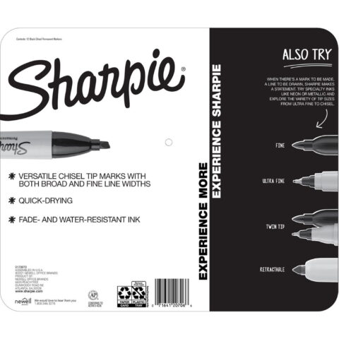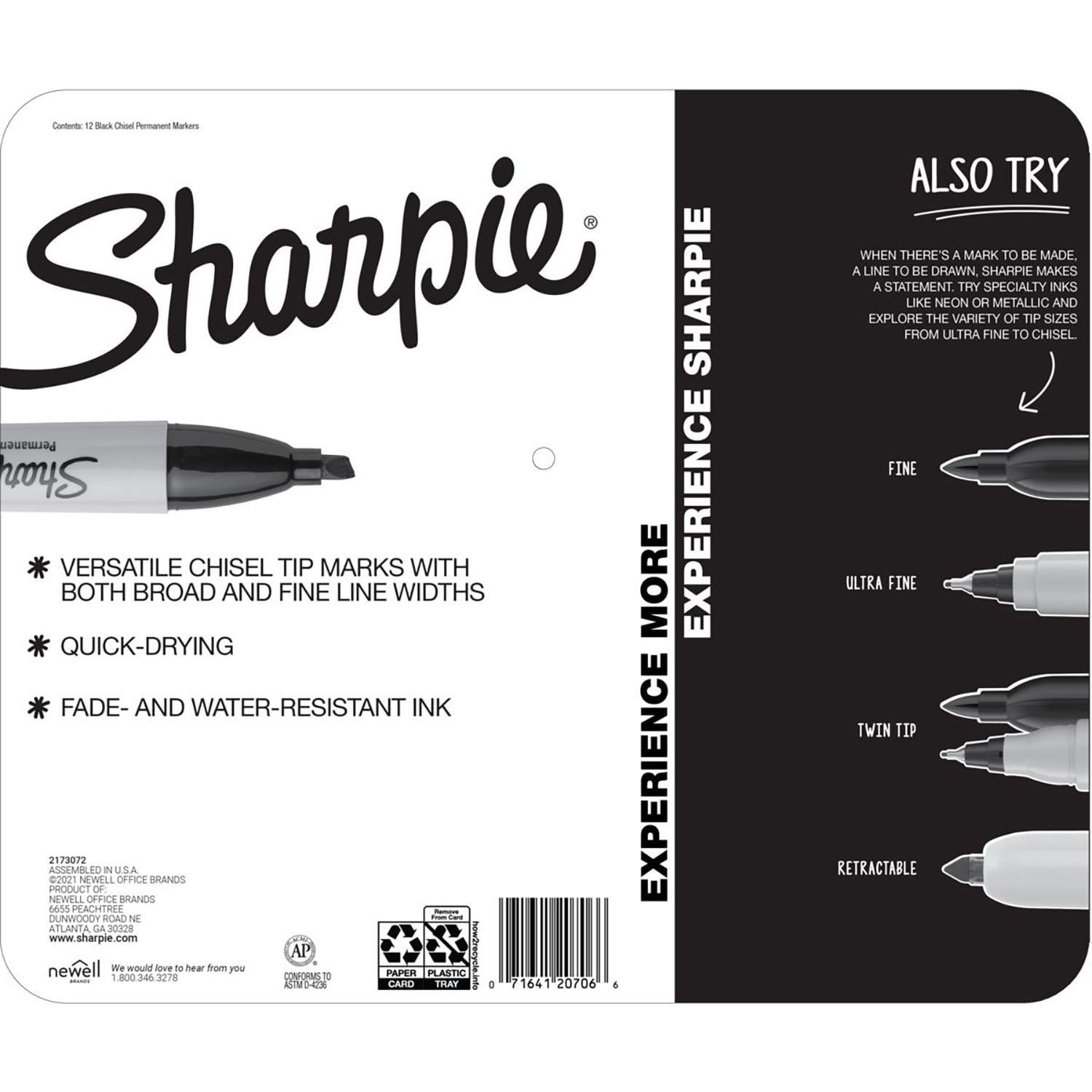 Create bold signs and charts with these Sharpie chisel tip permanent markers. The versatile chisel tip produces thick, medium and thin strokes to let you vary the line sizes for creative branding and writing in small spaces, making it suitable for use in multiple classroom, home and office applications. With a permanent quick-drying formula, these Sharpie chisel tip permanent markers avoid smudging and resist fading and water damage to deliver clean, long-lasting quality. The black color contrasts with most backgrounds to improve legibility and make your labels stand out.