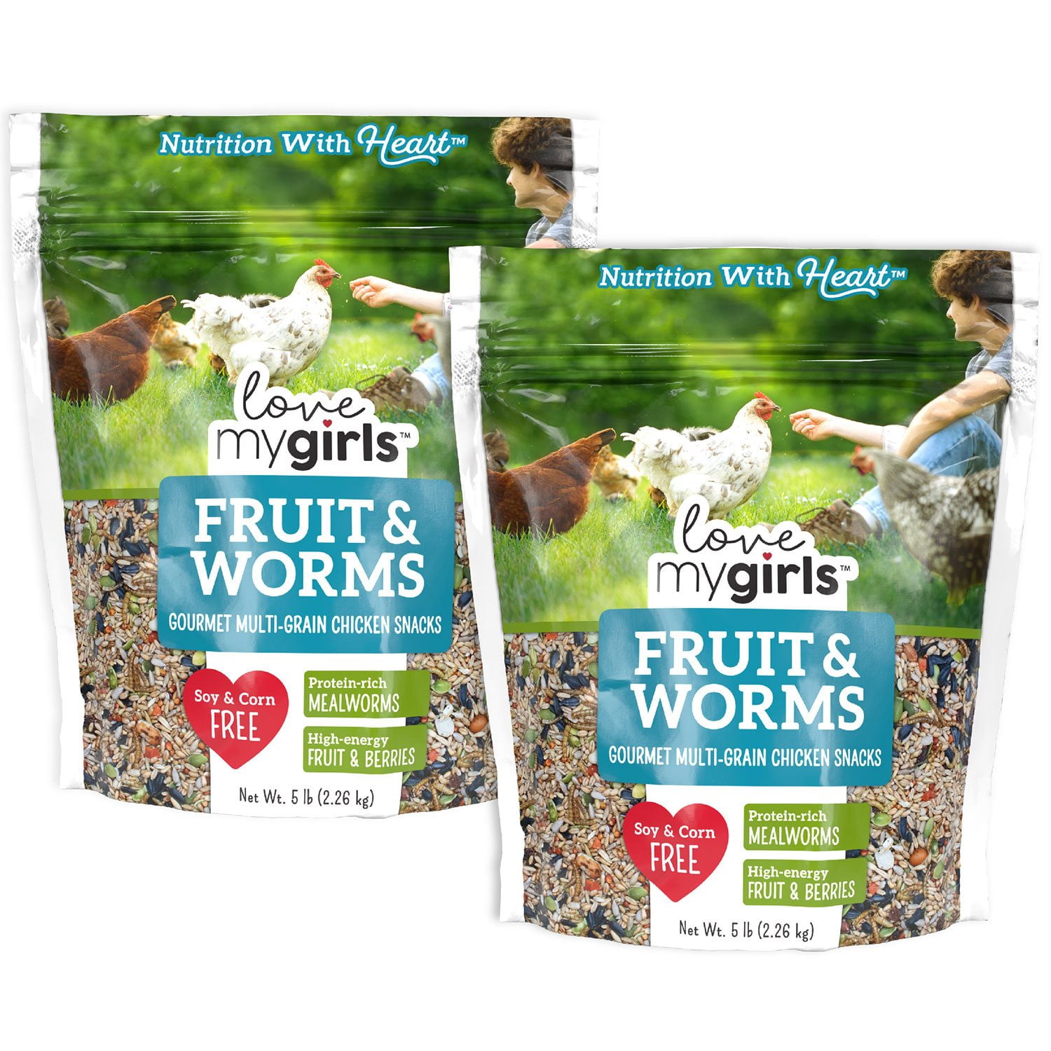Your hens will come running for Love My Girls Fruit & Worms gourmet chicken treats. Your girls will enjoy snacking on our gourmet treats filled with a wide array of nutritious ingredients! Oil-rich sunflower seeds provide healthy fat, and peanuts and mealworms are rich in protein. Sweet morsels of raisins, papaya, and cranberries are a natural source of energy, and pumpkin seeds are rich in vitamins and minerals. Plus, we’ve added oyster shells for strong eggshells!