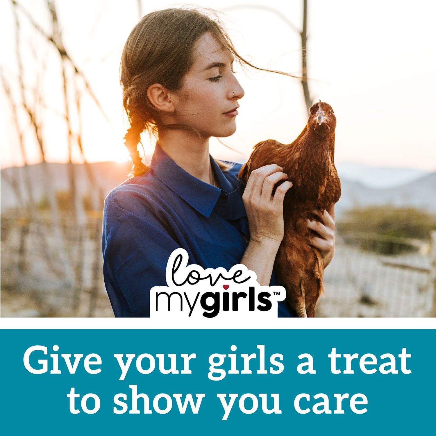 Show your girls you love them with Love My Girls gourmet chicken treats. Our Fruit & Worms treat contains zero corn and no soy for better balanced nutrition. Plus, it has been fortified with NutriThrive vitamins and minerals to help support overall hen health so your girls can live their happiest, healthiest lives. Now that’s nutrition with heart they’ll come running to eat!