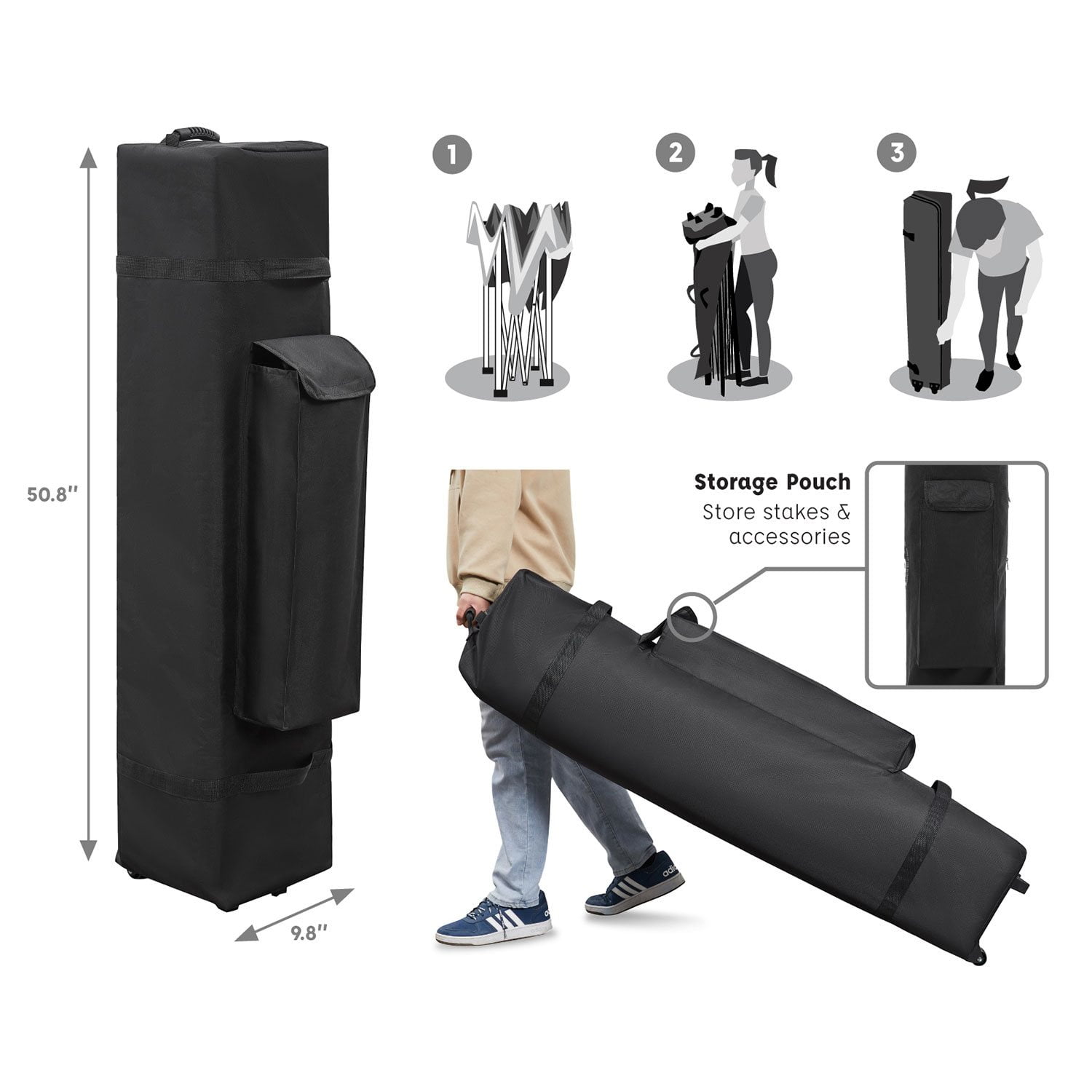 The Member’s Mark 13’x13’ Instant Canopy comes with a 600D polyester expandable wheeled carry bag for easy transport and storage. It also includes 8 steel ground stakes and 4 guyline ropes attached to the canopy top to anchor your canopy to the ground, ensuring stability and safety during use.