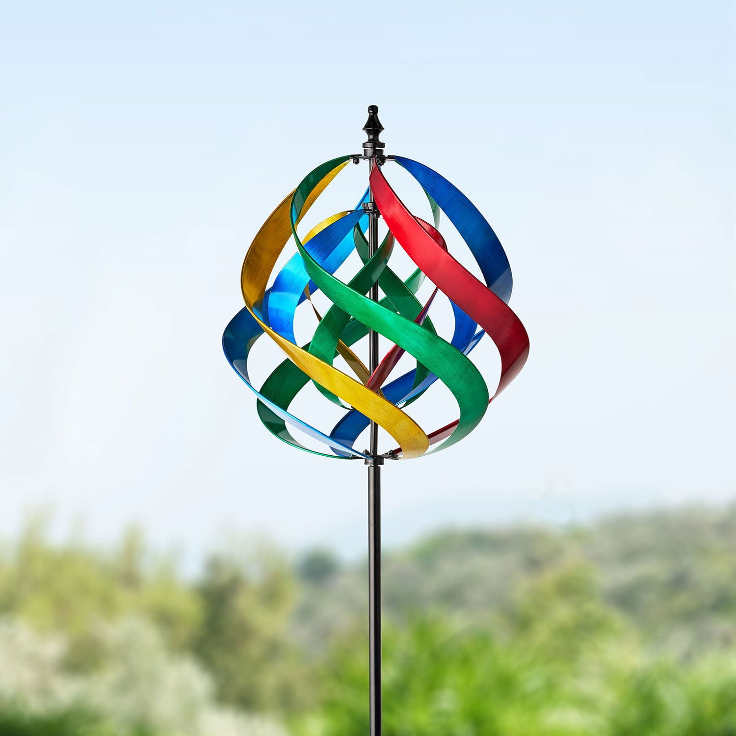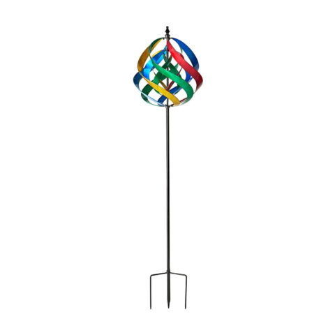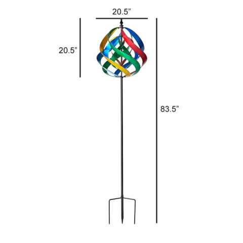 Transform your garden or outdoor space with this stunning kinetic wind spinner. The design features vibrant, swirling panels that create a captivating visual effect. The circular design, which includes an inner and outer helix, spins with the wind, creating a mesmerizing spectacle that will captivate the attention of anyone who visits your garden.