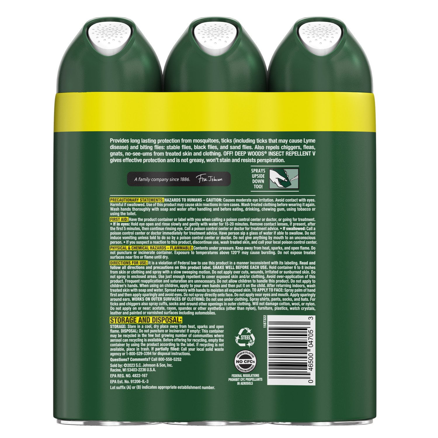 OFF! Deep Woods Insect Repellent V aerosol provides long-lasting protection against biting insects such as mosquitoes, black flies, sand flies, chiggers, gnats, and ticks, including those that may carry Lyme disease. It also repels fleas and no-see-ums. These aerosol mosquito sprays ensure easy application, so you can keep living life your way, repel mosquitoes, and enjoy the outdoors uninterrupted. Ideal for camping, fishing, hiking and hunting. Keep out of reach of children and pets. See the label for other precautions and usage directions.