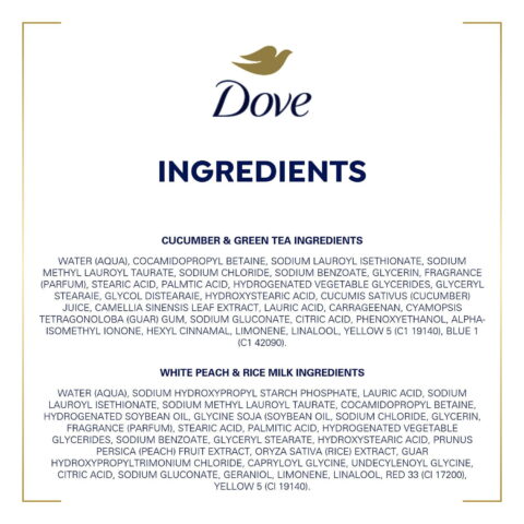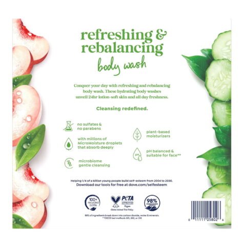 Dove Refreshing Body Wash with Cucumber & Green Tea revitalizes your skin with its cooling cucumber and green tea extracts, while the Dove Rebalancing Body Wash with White Peach & Rice Milk offers a calming and soothing experience with its delightful peach scent. Both body washes are infused with millions of moisturizing microdroplets that work with your skin’s natural renewal process to retain and boost moisture, leaving your skin soft, healthy-looking, and rejuvenated.
