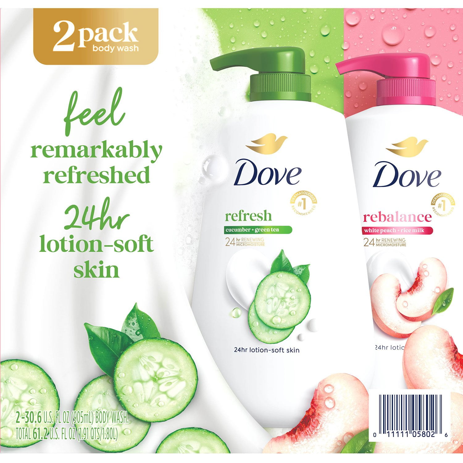 Indulge in a spa-like experience at home with the Dove Refresh & Rebalance Body Wash Collection. This variety pack features two luxurious body washes: Dove Refreshing Body Wash with Cucumber & Green Tea and Dove Rebalancing Body Wash with White Peach & Rice Milk, both in generous 30.6 oz pump bottles. These body washes are designed to refresh and rebalance your skin, providing deep nourishment and hydration for 24 hours.