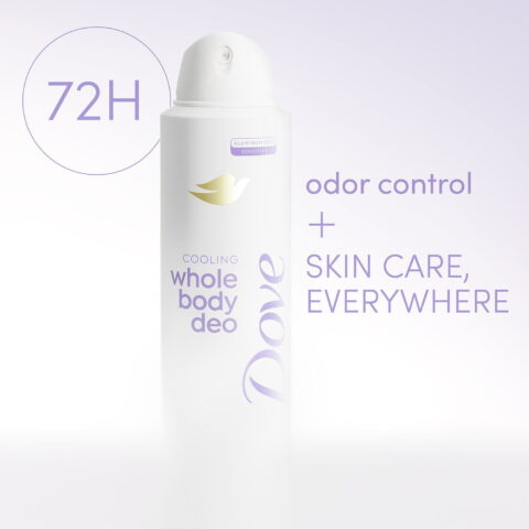 Ready for full-body freshness? Meet Dove Whole Body Deo Coconut & Vanilla Cooling Deodorant Spray. This invisible deodorant spray instantly cools your skin and delivers 72-hour odor control when you need it the most. From heatwaves to hot yoga, sweat and odor happen – and not just on our underarms.