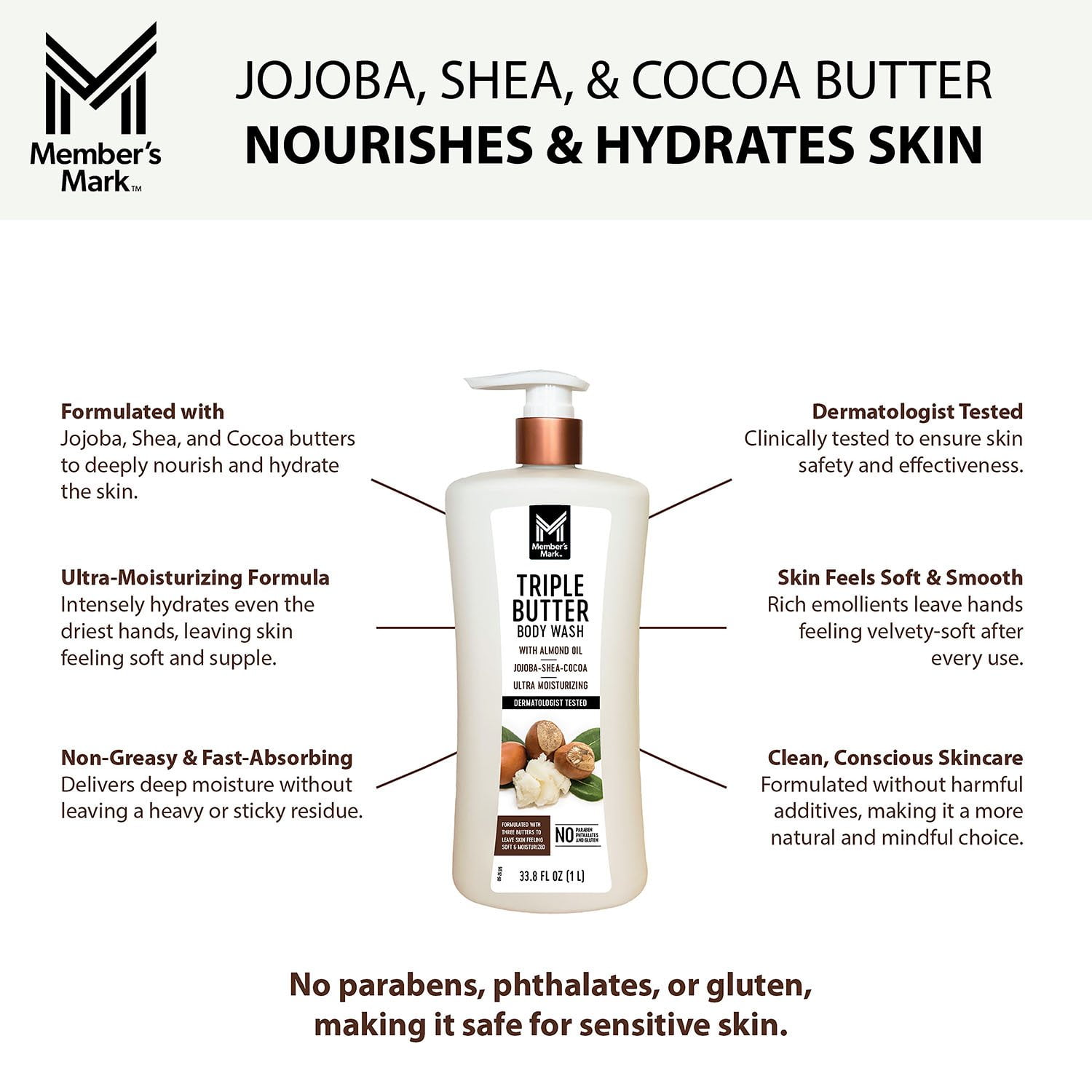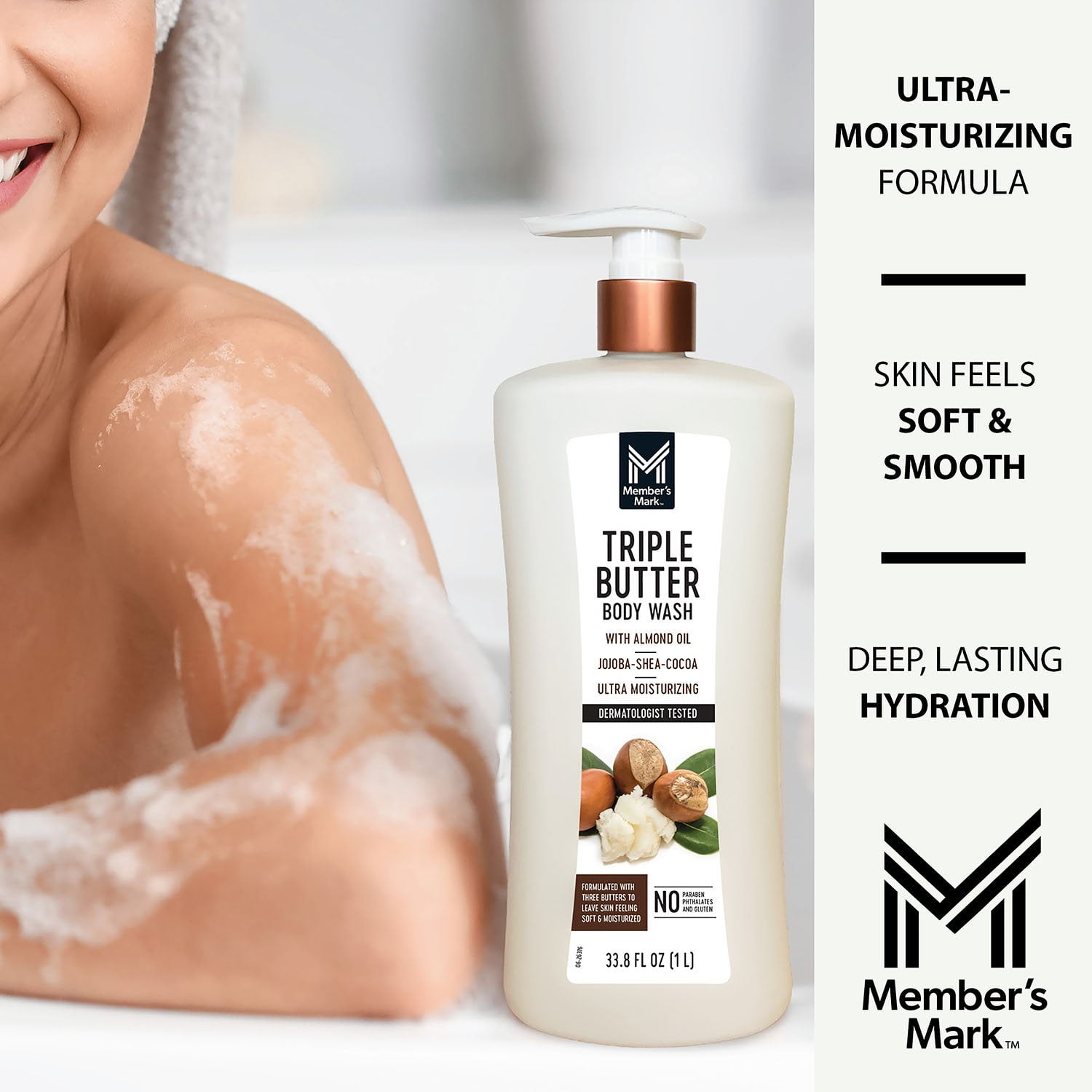 As a Member’s Mark product, this body wash is made with the highest quality ingredients and meets our rigorous quality standards. Enjoy the luxury of a high-end body wash at a value you’ll appreciate. Make your daily shower routine an experience with Member’s Mark Triple Butter Ultra-Moisturizing Body Wash.