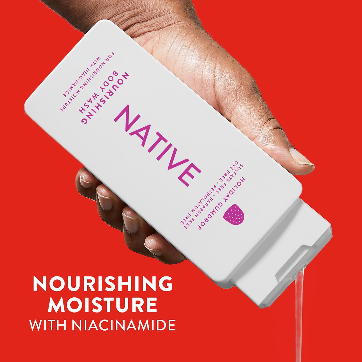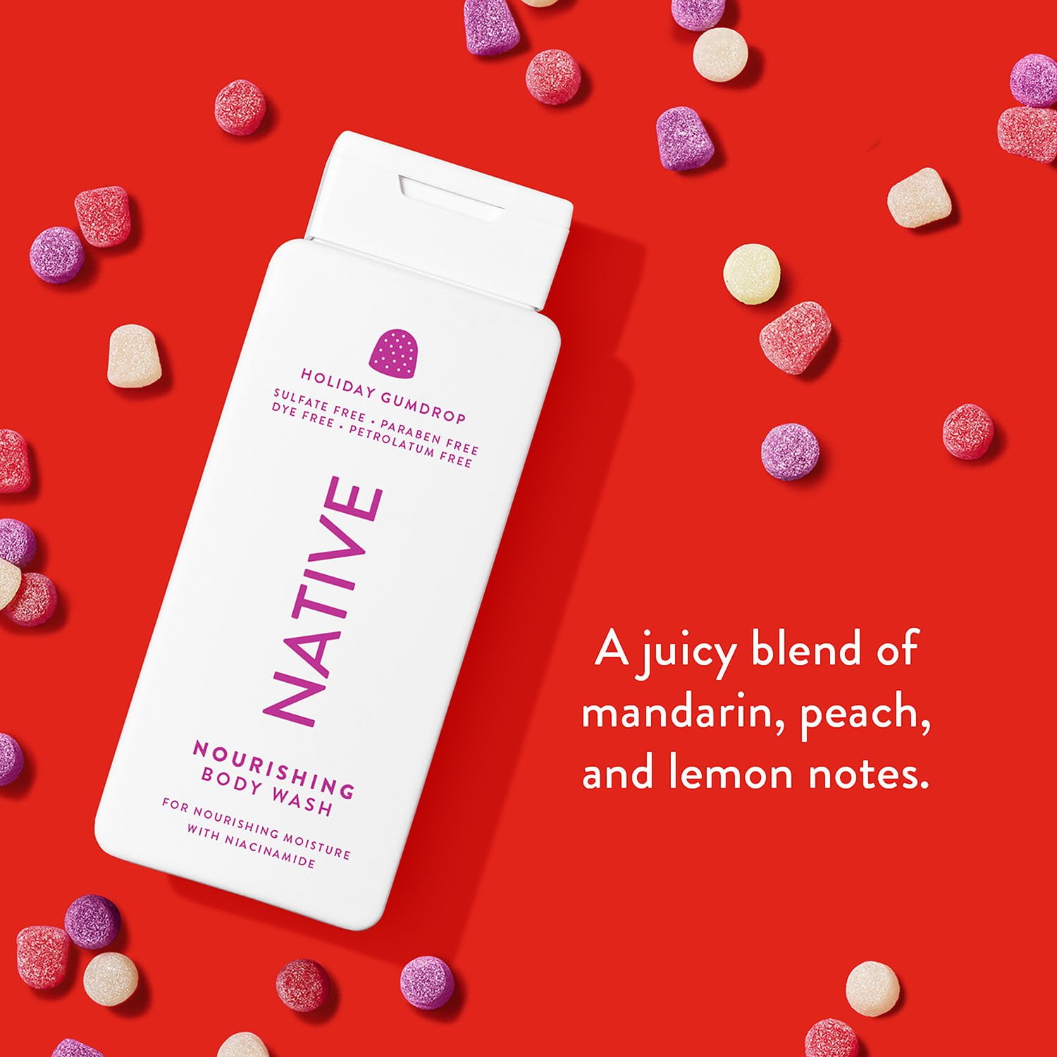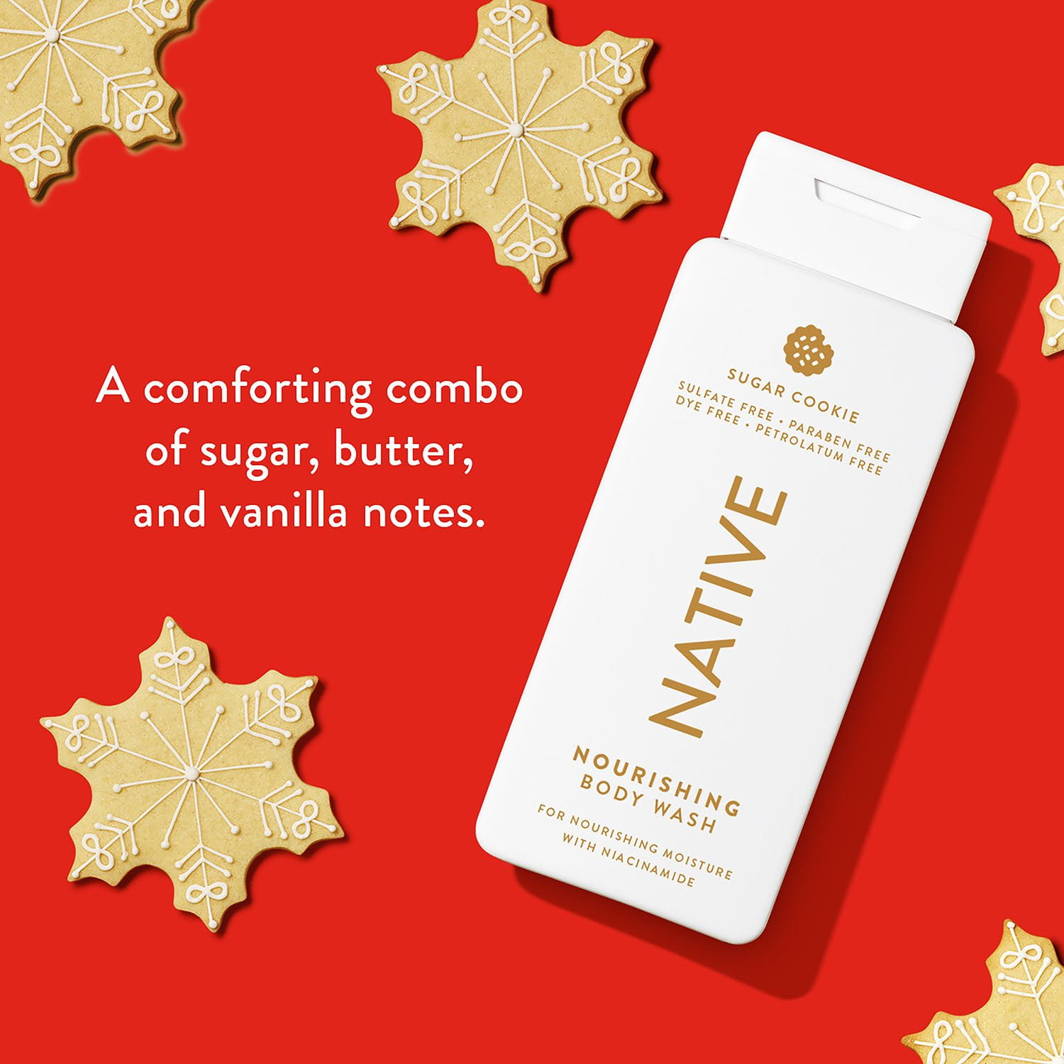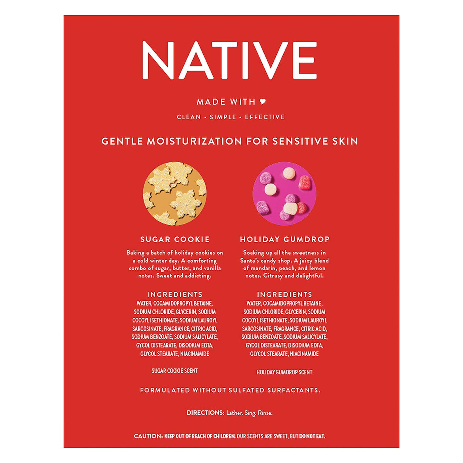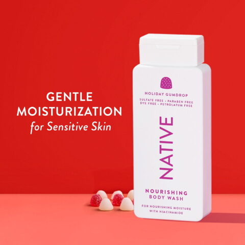 Celebrate the holiday season with Native’s sweetest scents: Sugar Cookie and Holiday Gumdrop. This limited edition 2-pack Holiday Nourishing Body Wash is crafted to deeply nourish and hydrate your skin while enveloping you in the delightful aromas of festive treats. Perfect for sensitive skin, the collection features a thoughtfully blended formula enriched with niacinamide and plant-based moisturizers, ensuring your skin feels soft, smooth, and refreshed all day long. Dive into the “sud-sational” rich lather that Native is renowned for. Our formula is free from sulfates, parabens, dyes, and petrolatum—clean and simple for a worry-free shower experience. Each wash provides gentle moisturization tailored to your skin’s needs without any compromises.