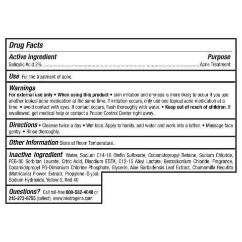 This daily face wash is residue- and oil-free formula and is non-comedogenic, so it won’t clog pores. This daily acne face wash also rinses clean without over drying or irritating the skin to help unclog pores and treat acne even before it emerges. Cleanse twice a day. Wet your face. Apply to hands, add some water and work into a lather. Massage face gently. Rinse thoroughly. And be sure to store at room temperature. From the #1 dermatologist-recommended acne brand, Neutrogena Oil-Free Daily Acne Wash is suitable for use as part of a regular acne-prone skin care routine.