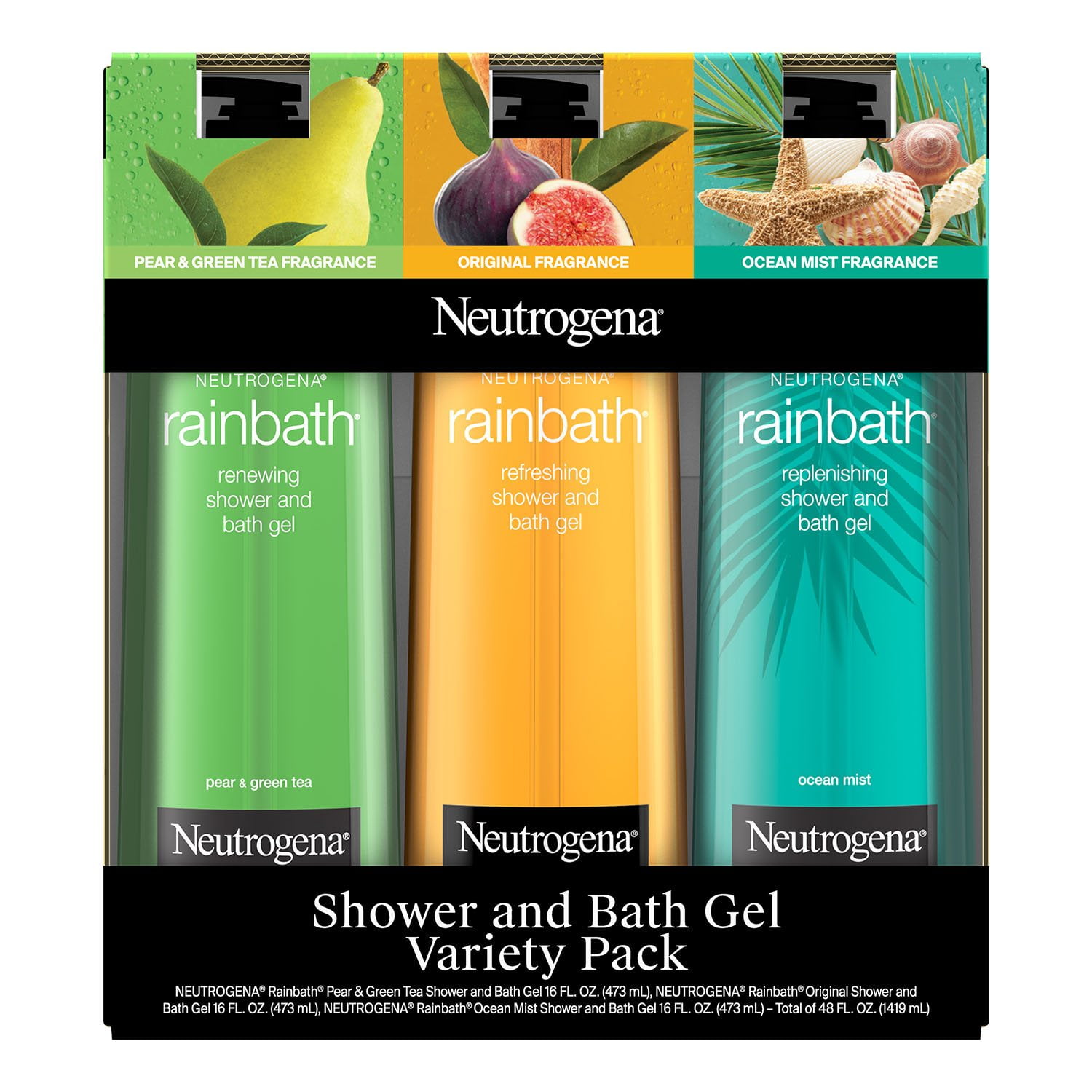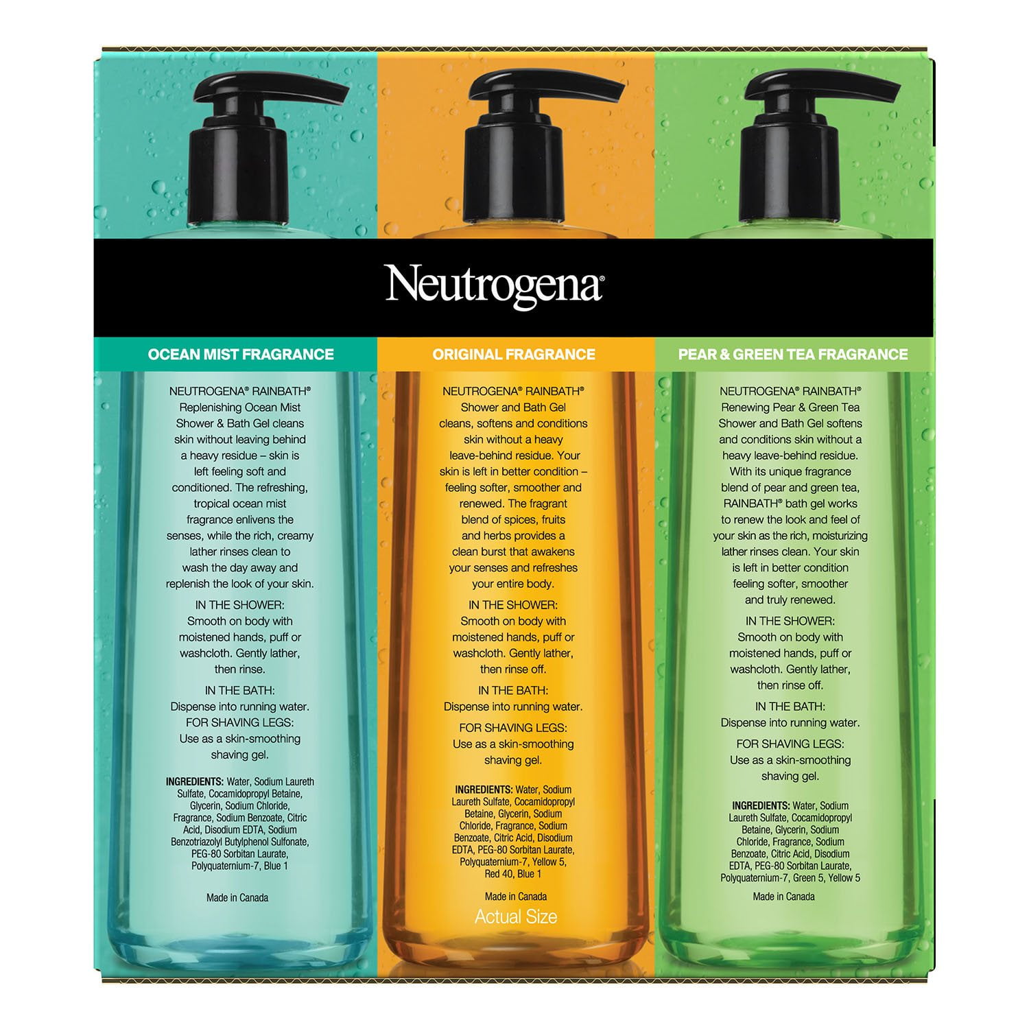 This Neutrogena Rainbath 3-pack includes Ocean Mist, Original, and Pear & Green Tea variants, catering to all skin types. Each gel is designed to cleanse and condition your skin, providing a variety of invigorating scents to enhance your shower or bath experience.