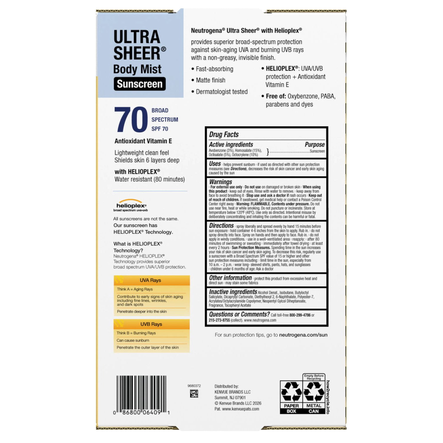 Neutrogena Ultra Sheer Body Mist Sunscreen Spray with Broad Spectrum SPF 70 offers robust sun protection that you’ll love to wear, helping to prevent sunburn. This sunscreen is formulated with Helioplex technology, providing superior UVA/UVB protection in an easy-to-use spray format. It’s a non-greasy sunscreen spray for the body that absorbs quickly, leaving a sheer, lightweight finish and a weightless, clean feel.