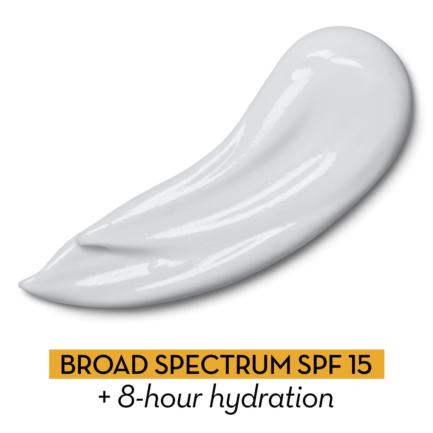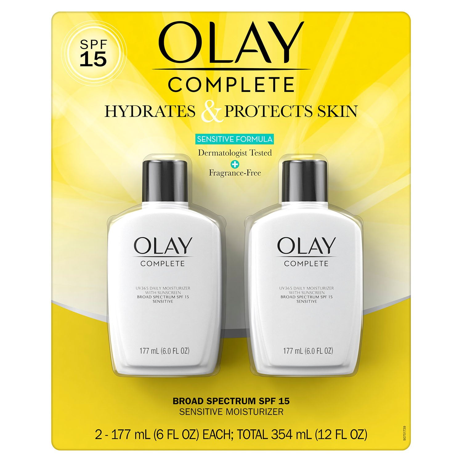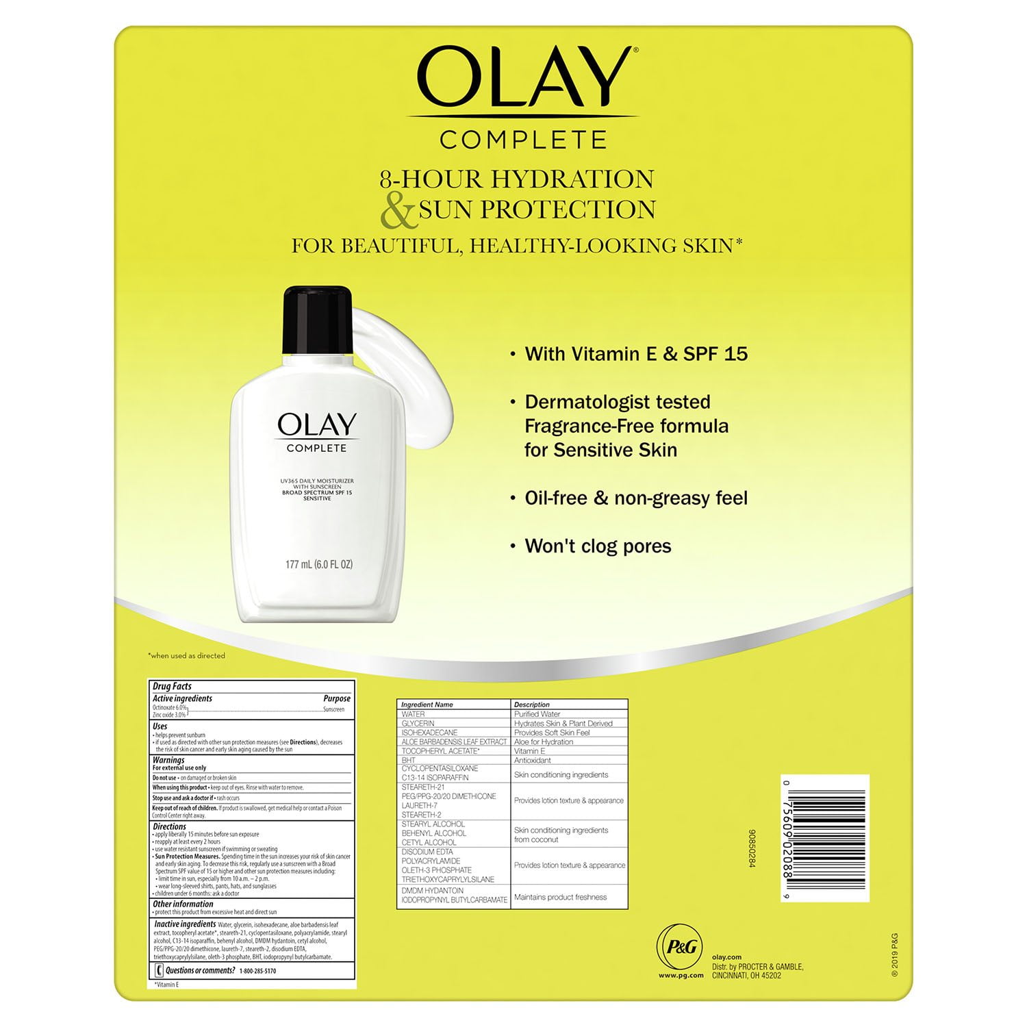 Olay Complete Daily Moisturizer with Broad Spectrum UVA/UVB Sunscreen SPF 15 is designed to shield your skin from the harmful effects of the sun’s rays, the leading cause of aging skin. Recommended by the Skin Cancer Foundation, this facial moisturizer provides essential sun protection while delivering 8 hours of hydration for sensitive skin.