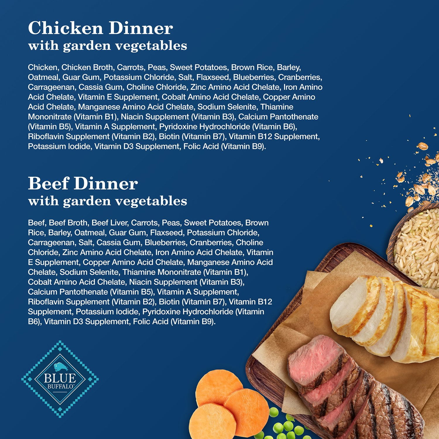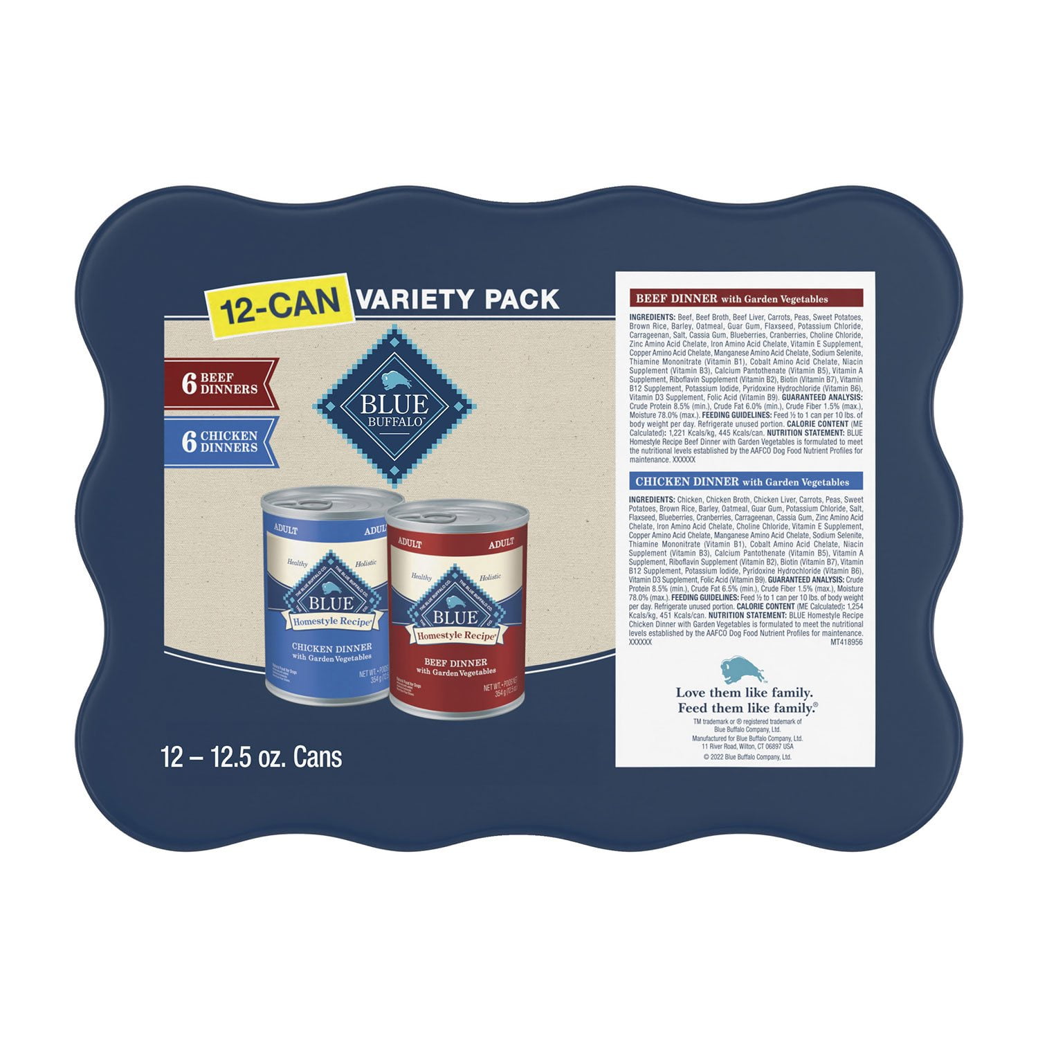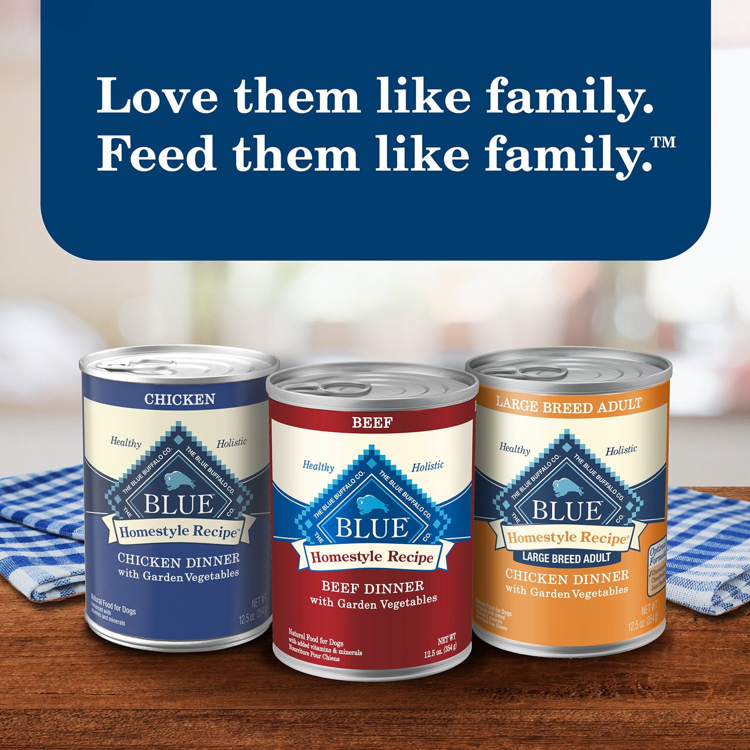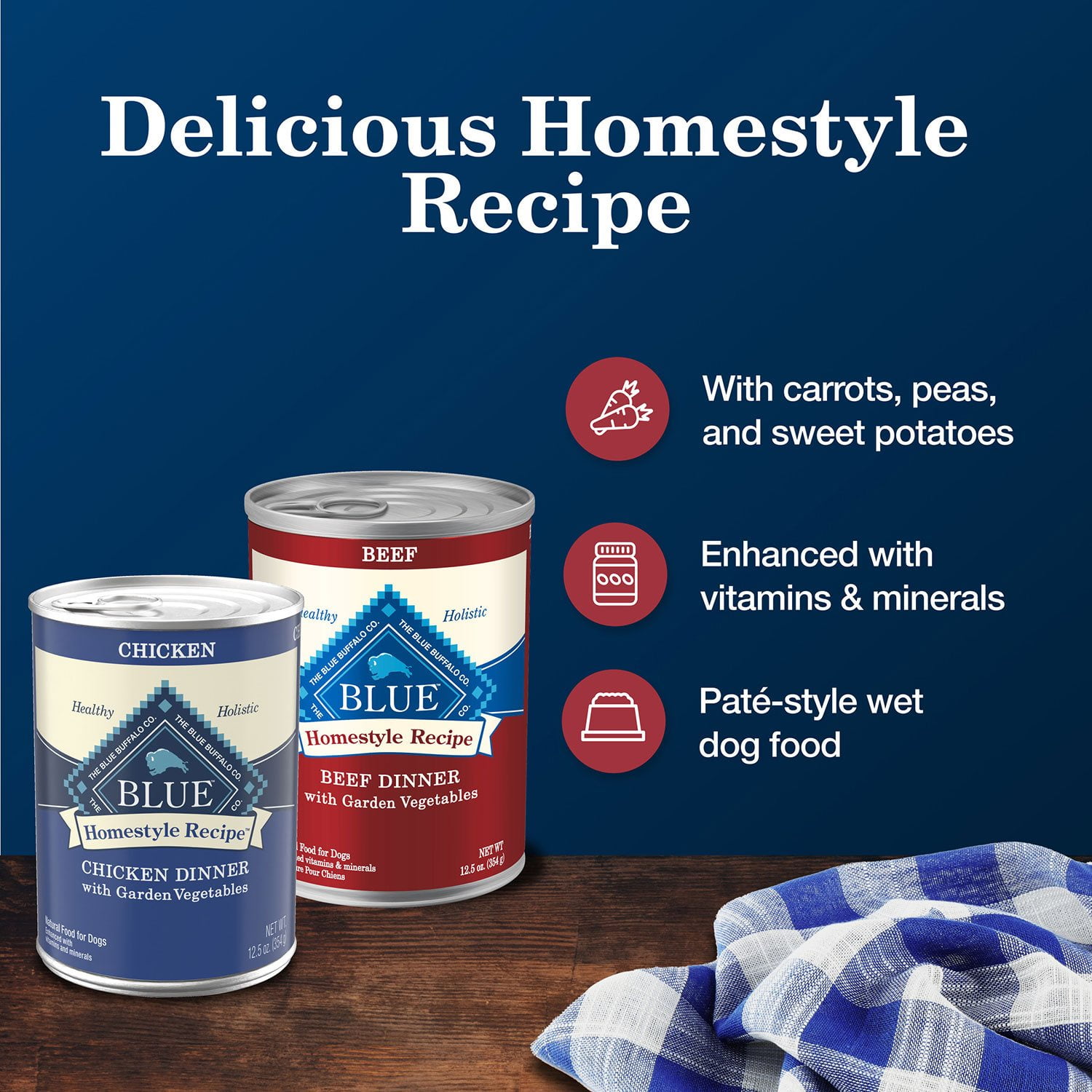 The Blue Buffalo Homestyle Recipe Natural Adult Wet Dog Food is irresistibly tasty wet food made by only using the finest natural ingredients. It starts with high-quality protein from tender chunks of chicken or beef, packed with garden fruit and veggies, then enhanced with vitamins and minerals. Formulated to support lean muscle mass and other nutritional needs, this pate-style dog food is made with wholesome ingredients that do not contain any by-product meals, corn, wheat, soy, artificial flavors or preservatives.