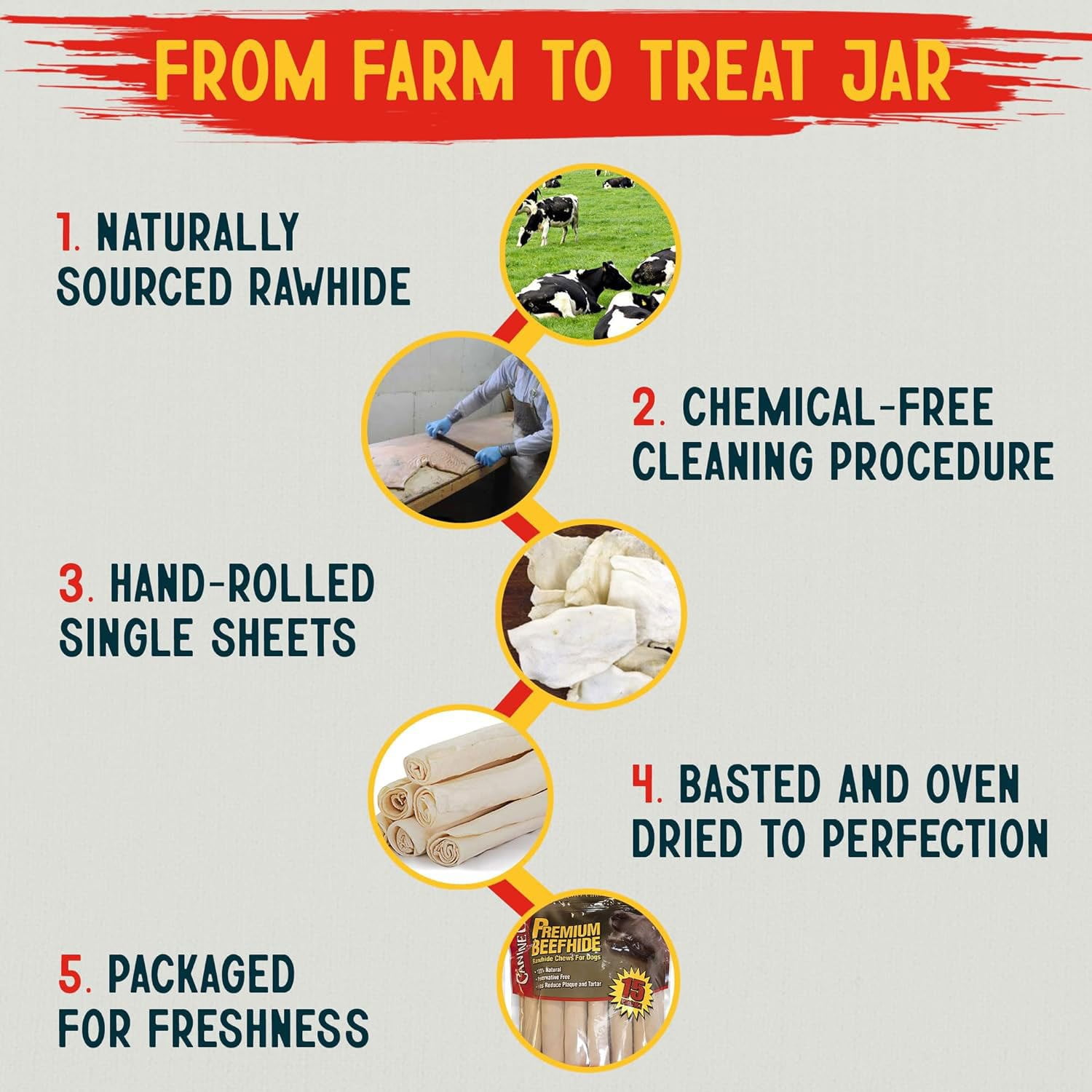 Canine Chews Premium All-Natural Beef Hide Canine Retrievers are made from high-quality beef hide to give your dog a treat that they are sure to love. Along with being a great chew, these treats can also help to reduce the amount of unhealthy plaque and tartar buildup, ensuring that your pet has bright and healthy teeth and gums for years to come.