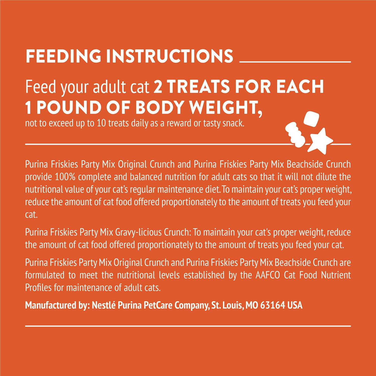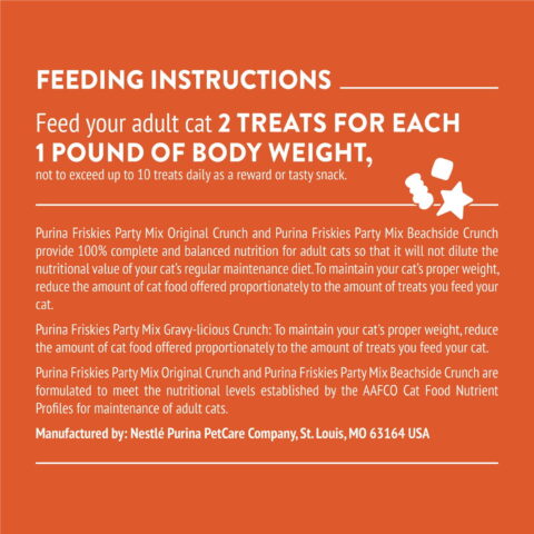 These Friskies Party Mix cat treats come in fun shapes that your cat will love to pounce on. Each treat delivers a unique taste experience that will have your cat looking forward to treat time. Plus, you can rest assured knowing that each delicious bite provides complete and balanced nutrition for your furry friend.