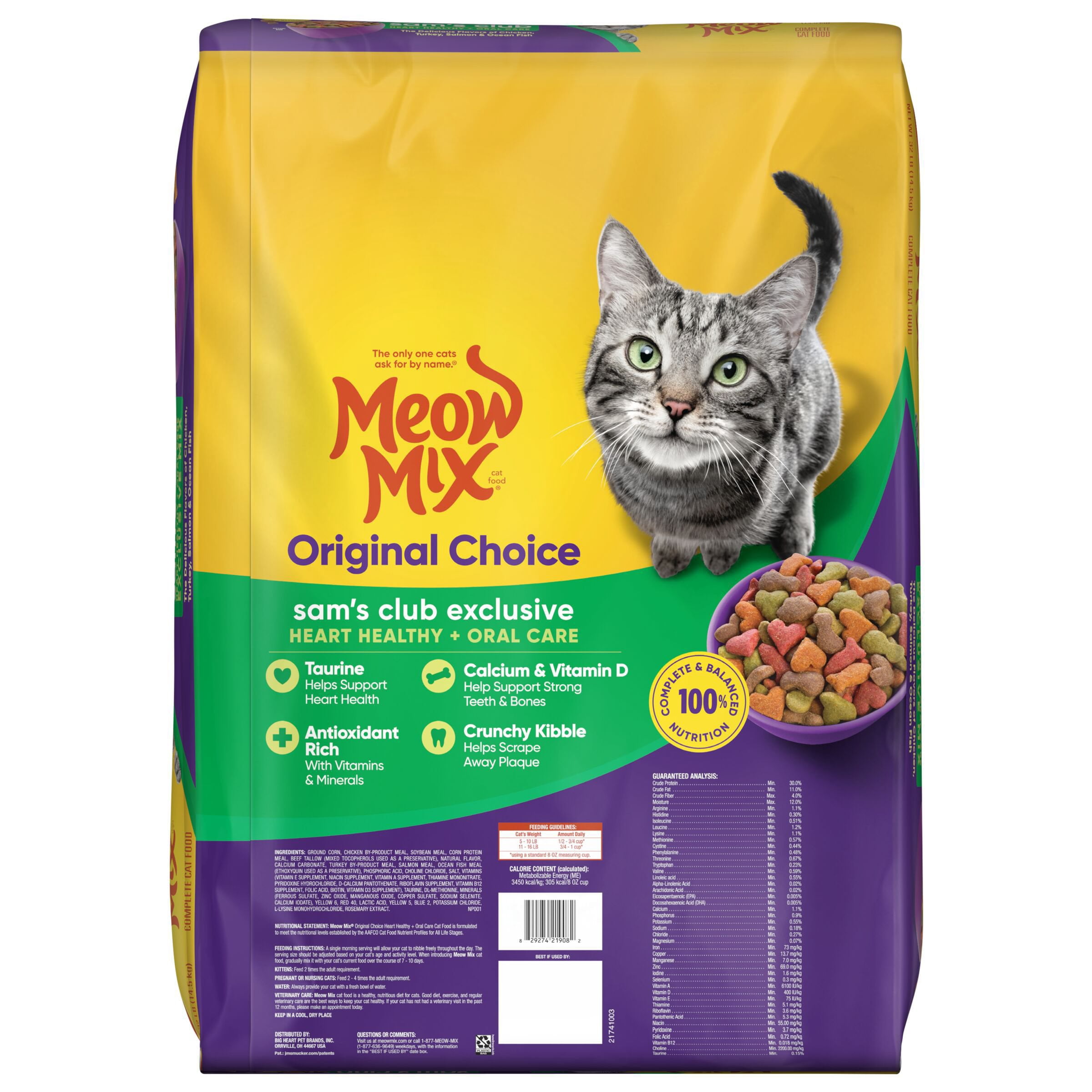 Meow Mix Original Choice Sam’s Exclusive Mix is a unique dry cat food formulated to help support your cat’s heart health and oral care. The mix includes new red heart and green leaf kibble made with the delicious flavors of chicken, turkey, salmon and ocean fish for an irresistible taste cats ask for by name. This flavor is the perfect way to connect with your cat over a healthy, delicious meal—only from Sam’s Club!