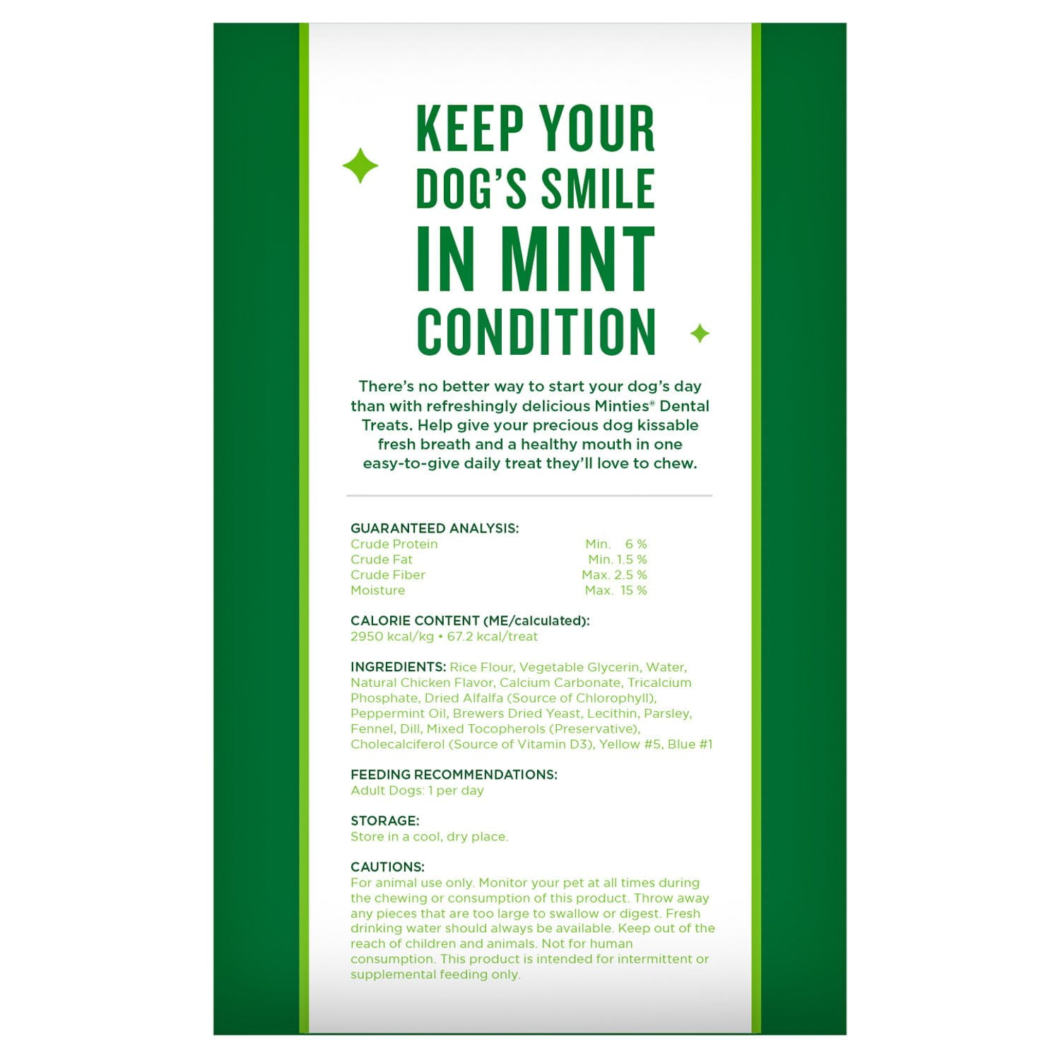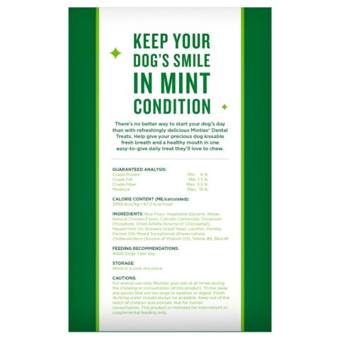 Minties for dogs are made to offer the same benefits to any dog. It doesn’t matter what its breed, size or age. All Minties dog treats are made in the United States and utilize ingredients that are proven to be effective in ensuring the oral health of dogs. With a fresh mint flavor, many dogs love these dog dental chews and will beg to have more. That isn’t something many can say when it comes to the alternative of brushing their dog’s teeth.