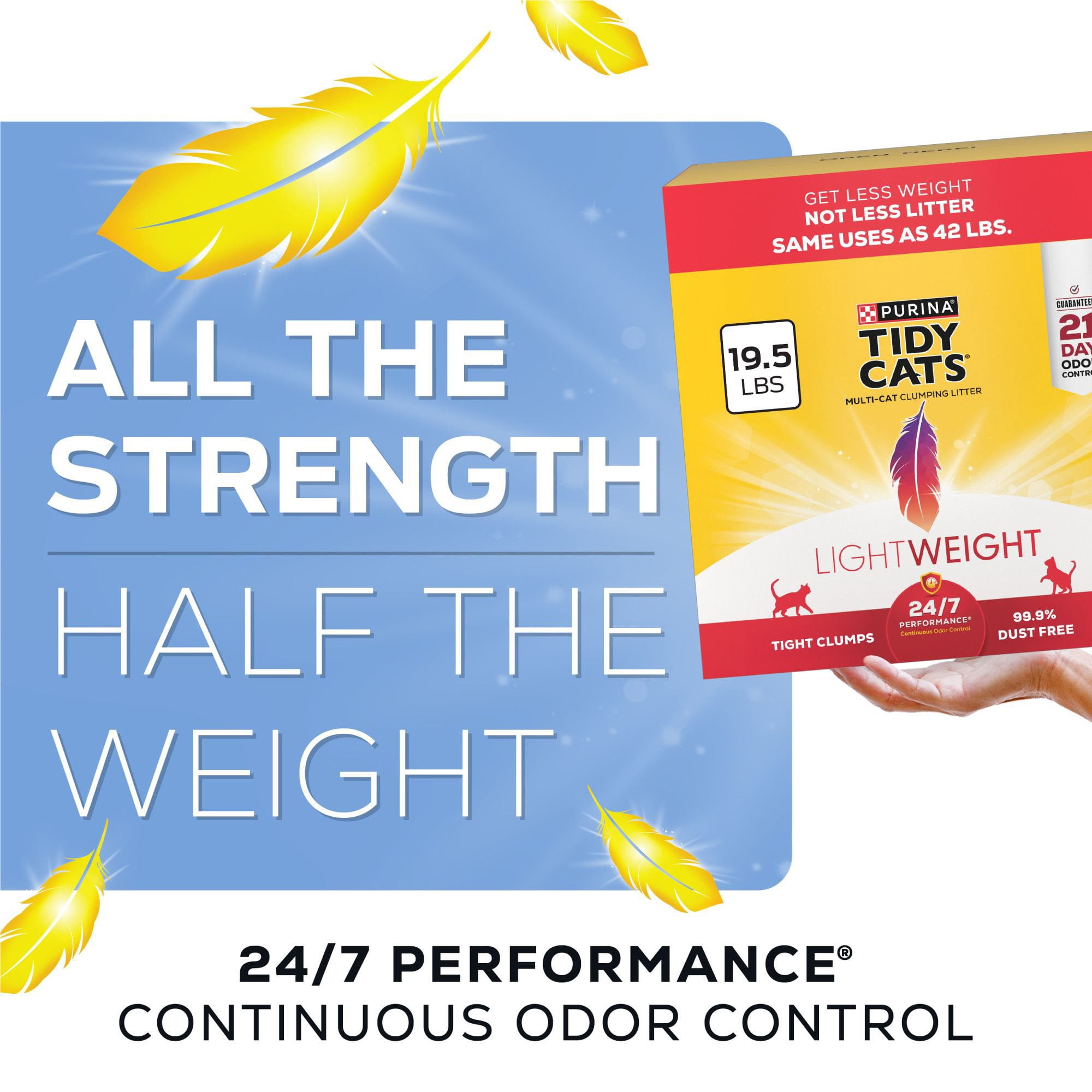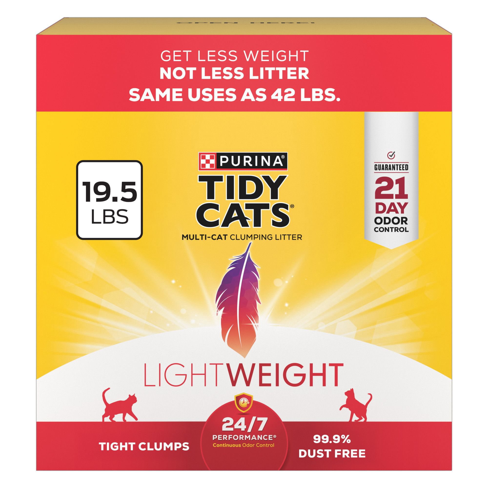 Lighten your load as you maintain your cats’ litter boxes with Purina Tidy Cats LightWeight 24/7 Performance clumping cat litter. This multi cat kitty litter contains triple-odor protection to defend your home against strong smells and leaves behind a fresh, clean linen scent. This lightweight clumping litter formula weighs half as much as leading clumping kitty litter, making it so easy to carry, you feel like saying, “Toss me that litter.”