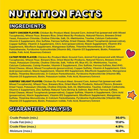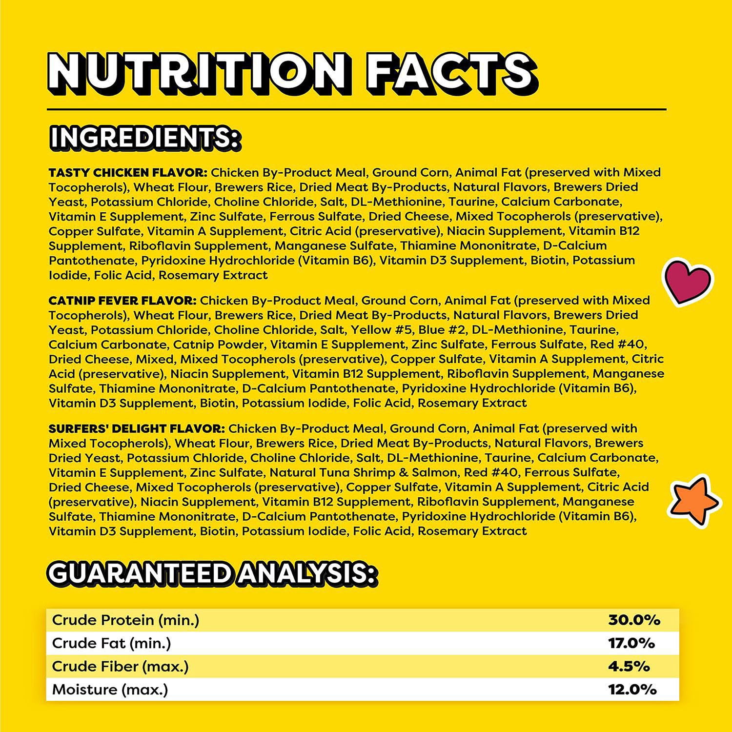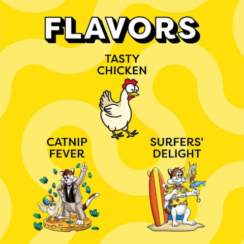 This variety pack includes three mouthwatering options: Tasty Chicken, Catnip Fever (Catnip, Cheese & Chicken), and Surfers’ Delight (Tuna, Shrimp & Salmon). Each treat is less than 2 calories and features a satisfying combination of crunchy and soft textures. Packaged in a stay-fresh tub, these treats remain fresh and ready for your cat to enjoy.