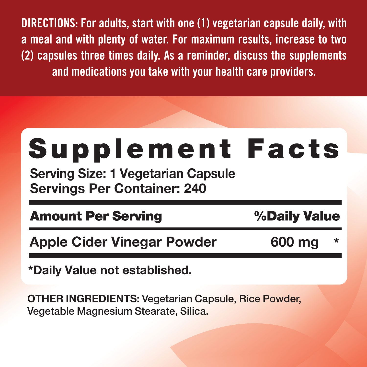 Guaranteed for quality, these Apple Cider Vinegar capsules will seamlessly become a part of your daily routine. Each capsule supplies you with an extra strength 600 mg of apple cider vinegar conveniently, and with no harsh or off-putting aftertaste.