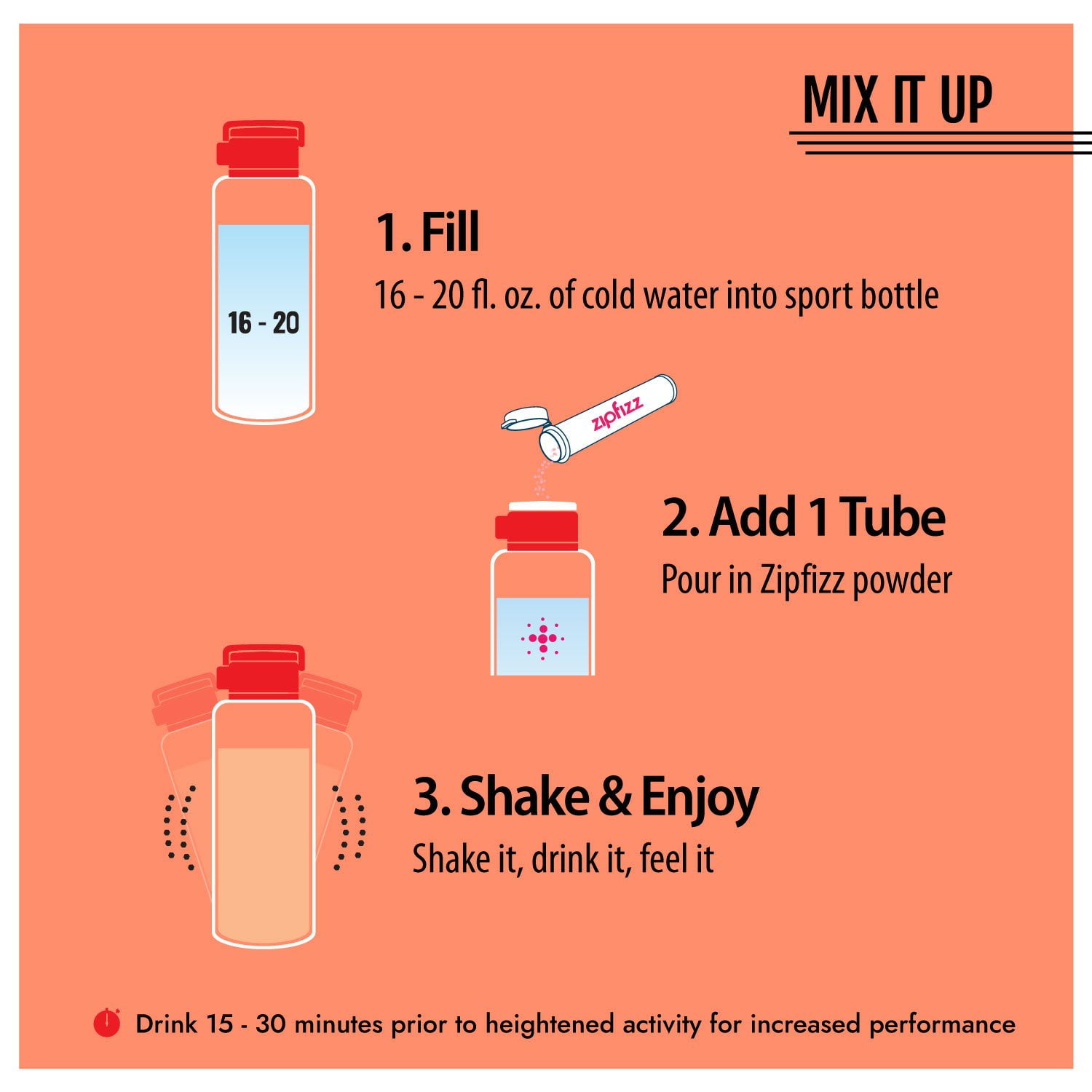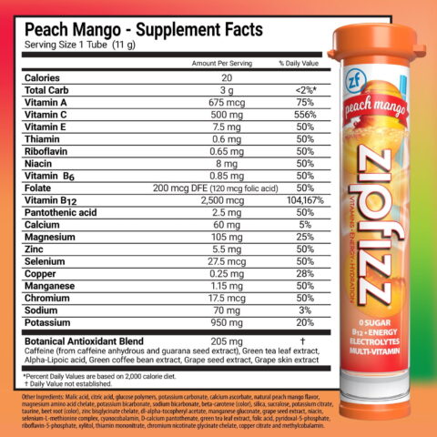 Experience a tropical blend of juicy peaches and sweet mangoes that transport you to a tropical oasis. Simply add Zipfizz powder to 16-20 ounces of water or other non-carbonated beverage, shake, and enjoy!