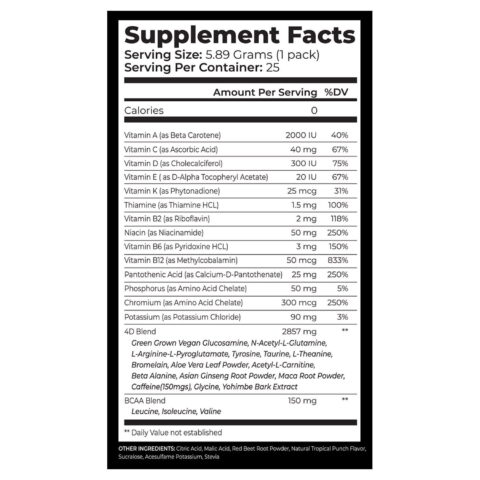 4D Clean Energy is an all-in-one daily health supplement, carefully designed by professional athletes. This premium supplement boasts a full multi-vitamin profile offering enhanced benefits. The innovative stick pack form eliminates the inconvenience of traditional buckets with scoops, condensed liquids or large pills, making it easy to consume and digest. This supplement is packed with Maca powder, B-12, Ginseng, Yohimbe, L-Theanine for long-lasting, jitter-free energy and focus. It also contains Glucosamine for improved joint mobility, Bromelain as a natural anti-inflammatory, and Aloe Vera for skin support. This is a truly holistic supplement that considers your overall well-being.