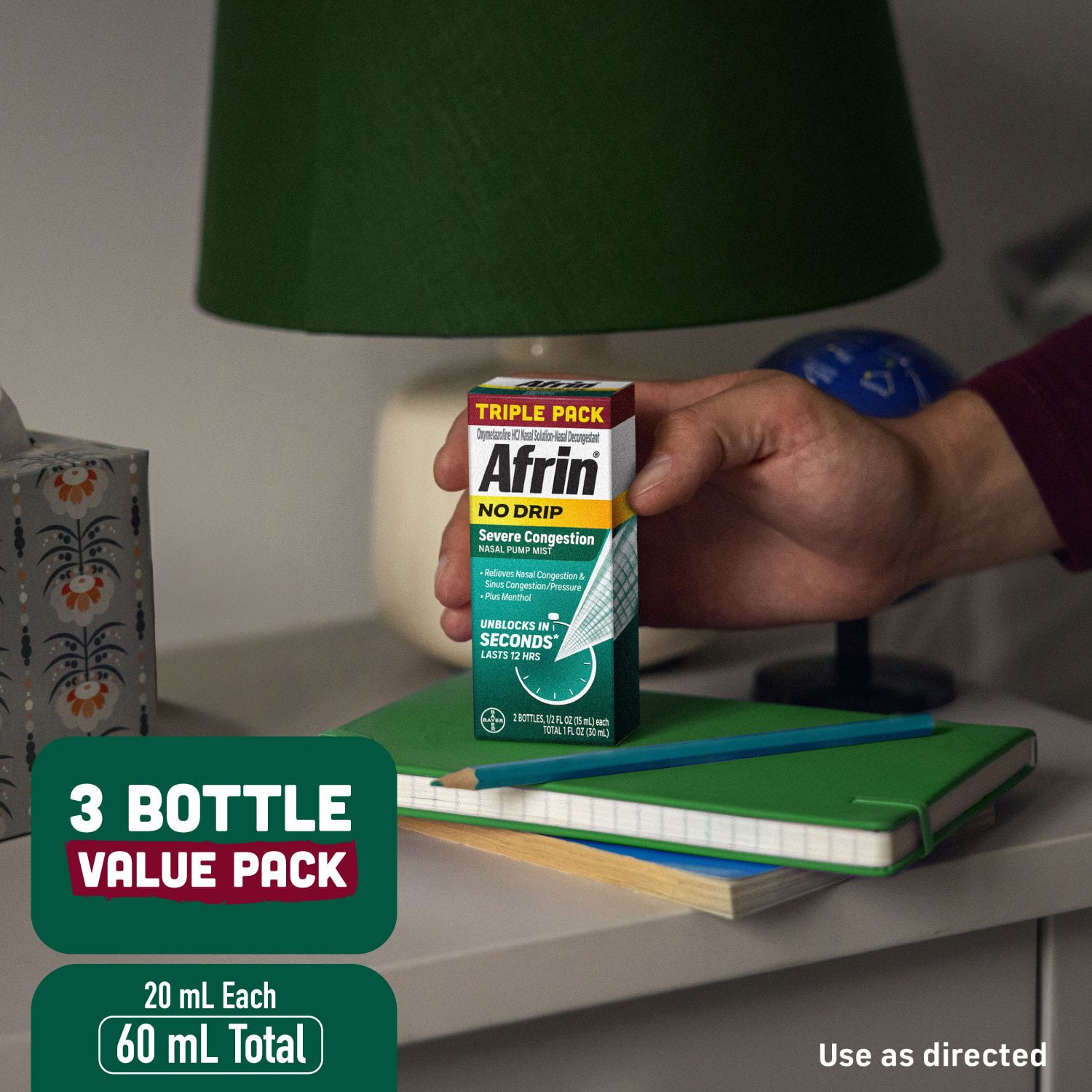 Each of the two Afrin Pump Mist bottles in this package contains 20 milliliters of maximum strength decongestant spray and the soothing scent of menthol. Afrin contains oxymetazoline hydrochloride to shrink nasal membranes and provide relief from congestion caused by the common cold, sinusitis, hay fever and allergies. Our formula works for up to 12 hours and does not cause drowsiness. You can take it in the morning and be alert and congestion-free all day long.
