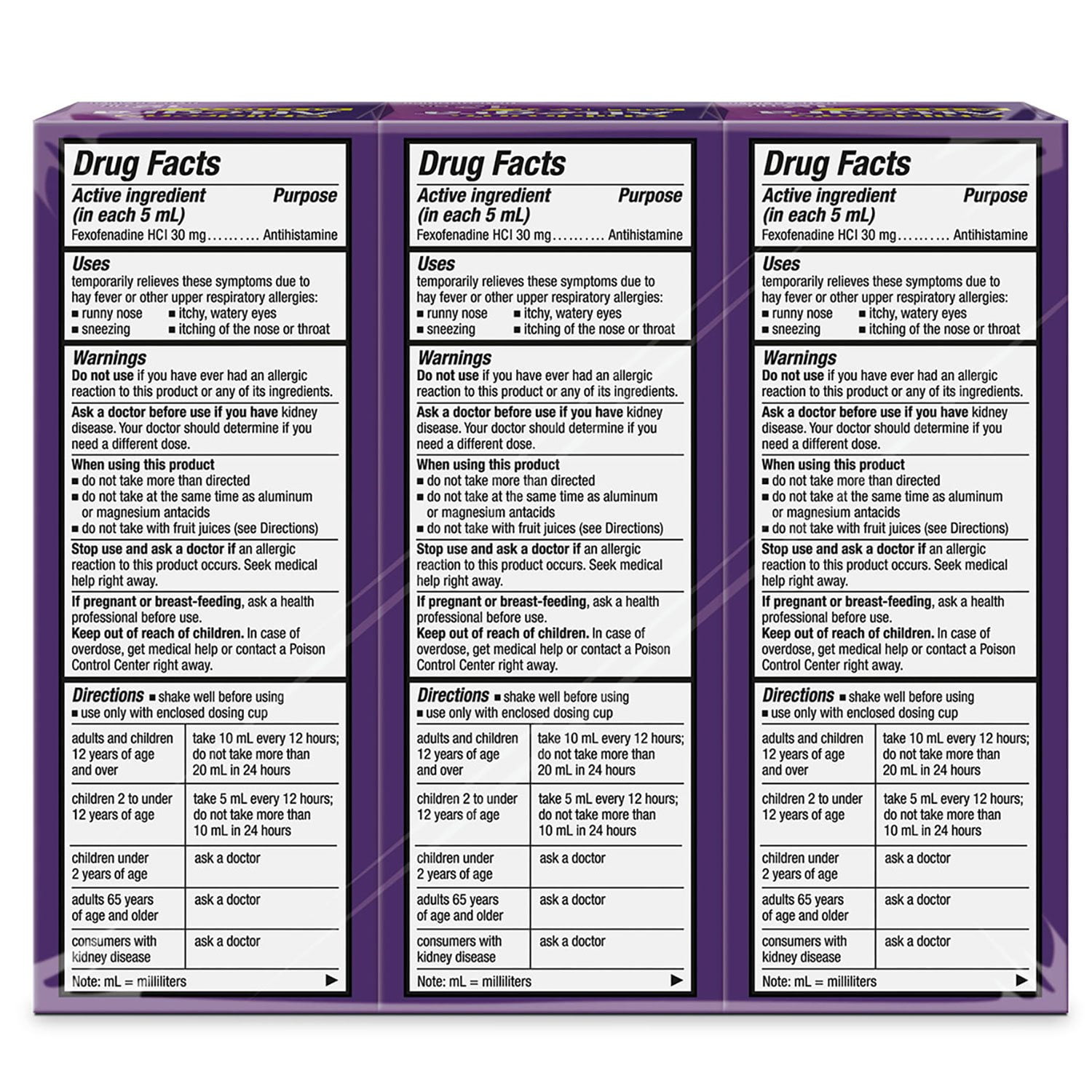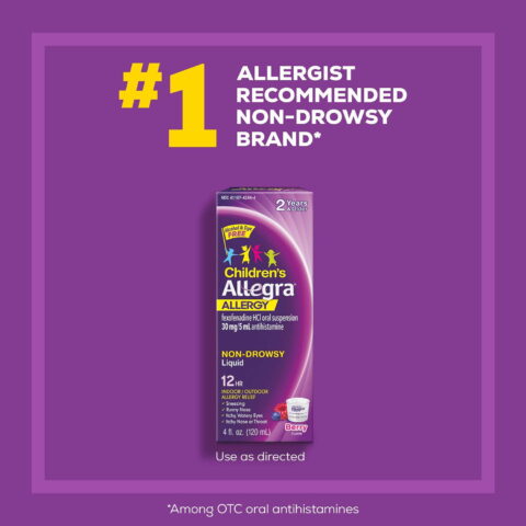 Kid allergies are unpleasant. Taking their allergy medicine doesn’t have to be. Alleviate their worst allergy symptoms with Allegra Children’s Non-Drowsy Antihistamine Liquid Berry Flavor. This Allegra Children’s Allergy Medicine pack contains three (3) 4 oz. bottles. Children’s Allegra for kids 2 years and older provides 12 full hours of non-drowsy relief from sneezing, runny nose, itchy and watery eyes, and itchy nose or throat. Use Allegra Children’s Liquid for indoor and outdoor allergies, including seasonal allergies and pet allergies. Best of all, this berry-flavored allergy medicine goes down smooth and is made with active ingredient fexofenadine, a non-drowsy antihistamine. Be ready for spring allergies, fall allergies, dog allergies and more. Stock up on Children’s Allegra 12-Hour Berry Flavor Liquid Allergy Medicine.