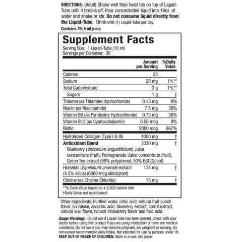 This truly unique and innovative product is specially designed to supply a full 4,000mg of collagen along with a broad spectrum of antioxidant activity and nutrients such as biotin and silica. Simply mix one concentrated Liquid-tube into 16 oz. of water per day.