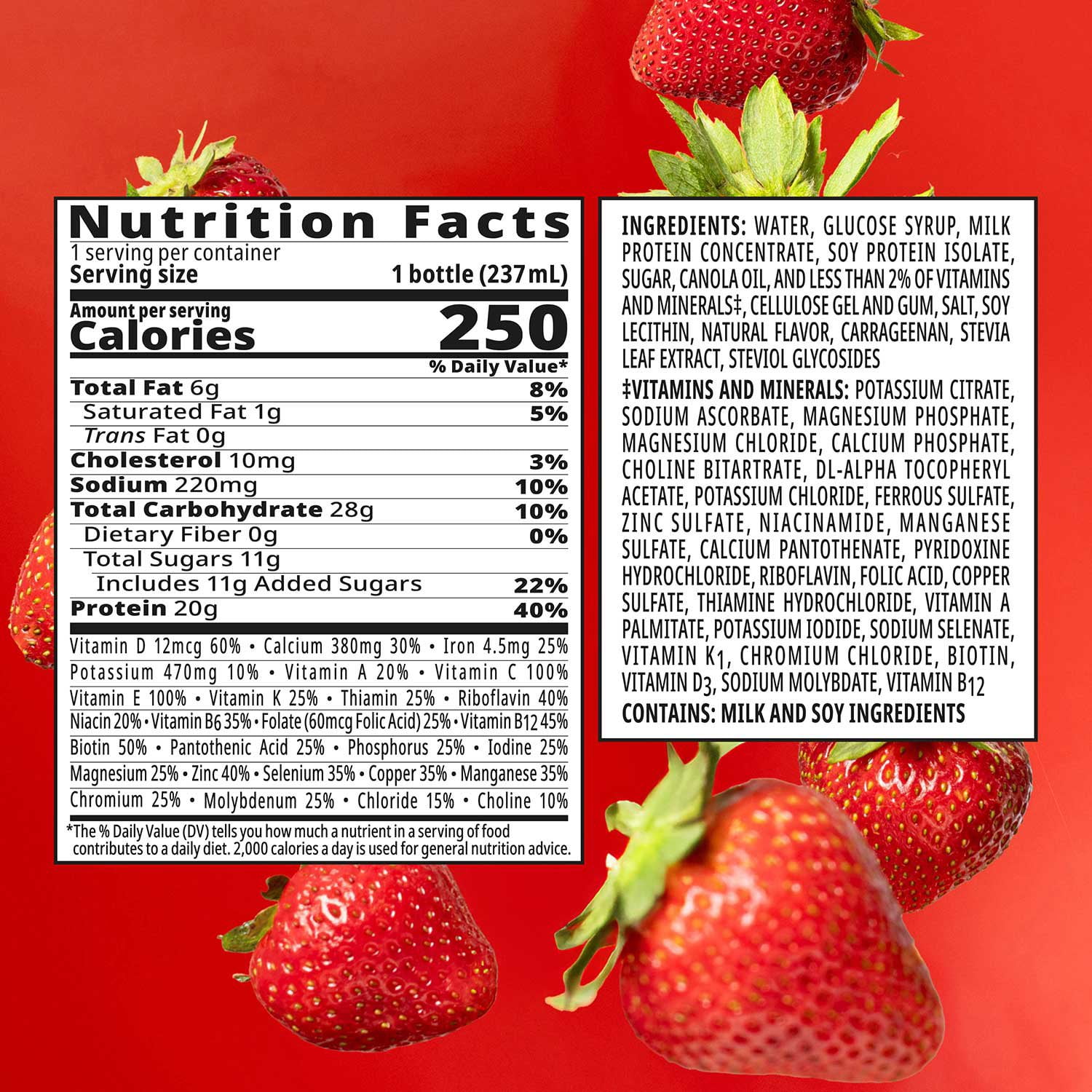 - 20 g of protein for muscle health and 27 vitamins and minerals per bottle