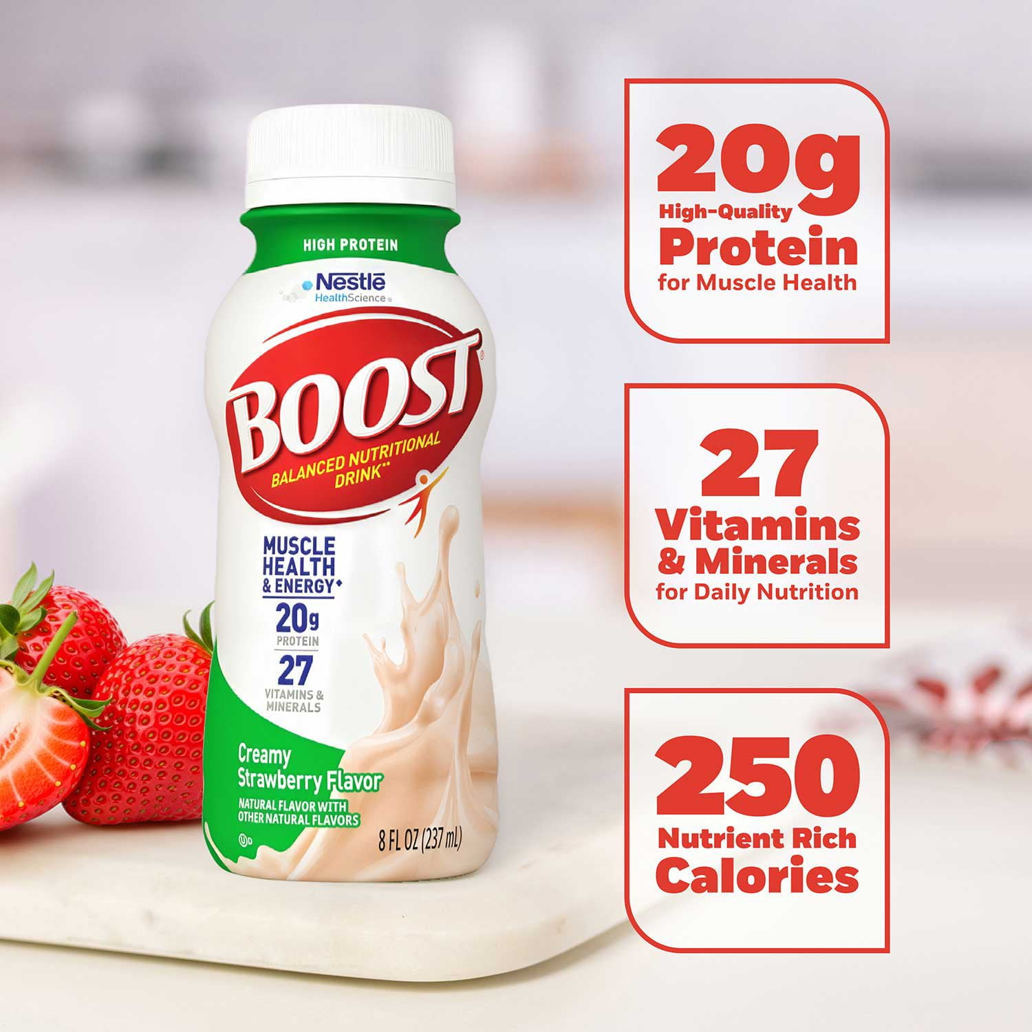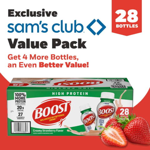 With places to go and memories to make, nutritional gaps shouldn’t get in the way. Creamy Strawberry flavored BOOST High Protein Nutritional Drink is a high protein nutritional shake that provides essential nutrients as part of a balanced diet. This strawberry flavored high protein nutritional drink provides 27 vitamins and minerals and 20 grams of protein per serving to help maintain muscle. Not only does this high protein drink provide 20 grams of high-quality protein, but it is also designed to provide nutritional energy with 250 nutrient-rich calories and B-vitamins to help convert food to energy. BOOST High Protein Nutritional Drink, Creamy Strawberry has a delicious strawberry taste you’ll love and 100% more protein than BOOST Original drinks (20 grams of protein in BOOST High Protein drink vs. 10 grams in BOOST Original drink). This pack includes 28 – 8 FL OZ ready to drink resealable bottles that are portable and easily stored. They are gluten free and contain no artificial colors, flavors or sweeteners. As a balanced nutritional drink or mini-meal, BOOST High Protein Nutritional Drink, Creamy Strawberry is a convenient way to help fuel up and support your active lifestyle. Help get extra protein you need and reward yourself with the delicious taste of BOOST High Protein Nutritional Drink, Creamy Strawberry flavor. Whether you want extra protein, less sugar, more calories, fewer calories, or simply great nutrition for everyday living, there is a BOOST nutritional drink that fits your needs!