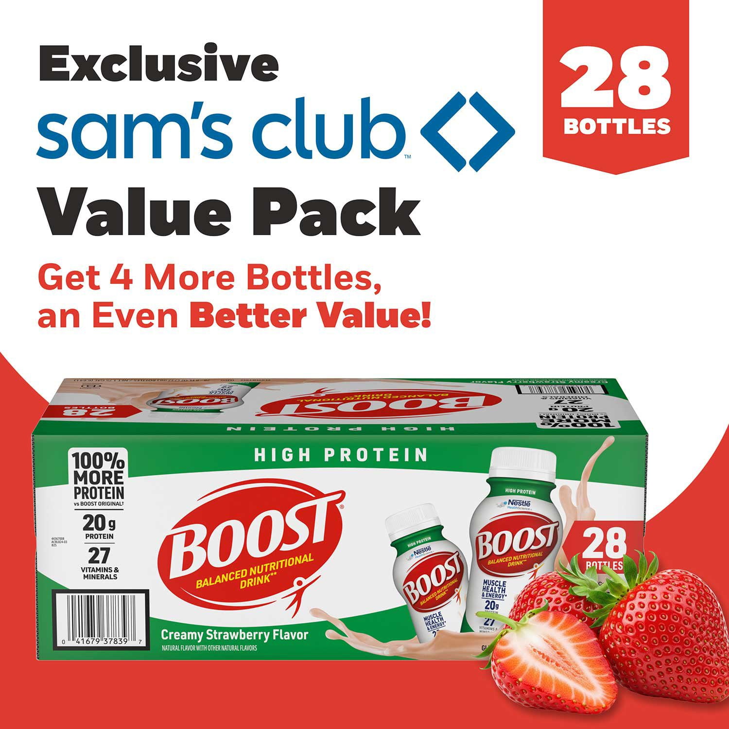 - 28 ready to drink 8 fl oz bottles of BOOST High Protein, Creamy Strawberry
