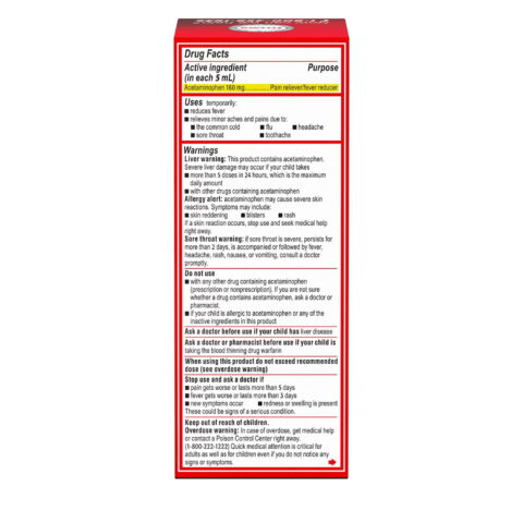 Each 5-milliliter dose of this oral suspension medicine contains 160 milligrams of the pain reliever & fever reducer acetaminophen for effective cold & flu symptom relief Kids’ liquid cold & flu medicine for children ages 2 to 11 years comes in a dye-free cherry flavor that is gentle on the tummy.