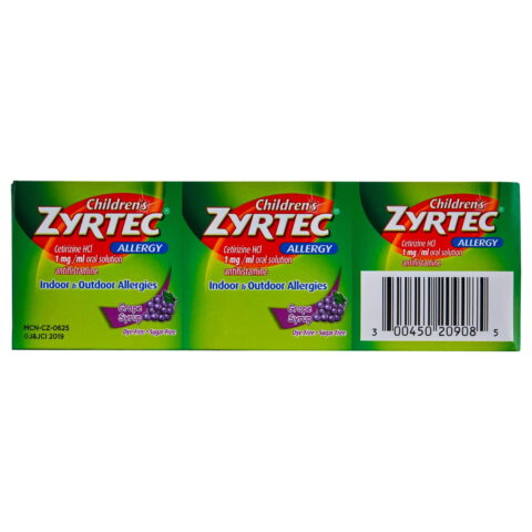 Children’s Zyrtec Allergy Syrup offers effective relief from a wide range of allergy symptoms, providing comfort for children suffering from indoor, outdoor, and seasonal allergies. Each 5 mL dose contains 5 milligrams of the antihistamine cetirizine hydrochloride, delivering reliable 24-hour relief from common symptoms associated with hay fever and upper respiratory allergies. This over-the-counter allergy medication is designed to alleviate discomfort caused by runny noses, sneezing, itchy and watery eyes, as well as itchy noses and throats.
