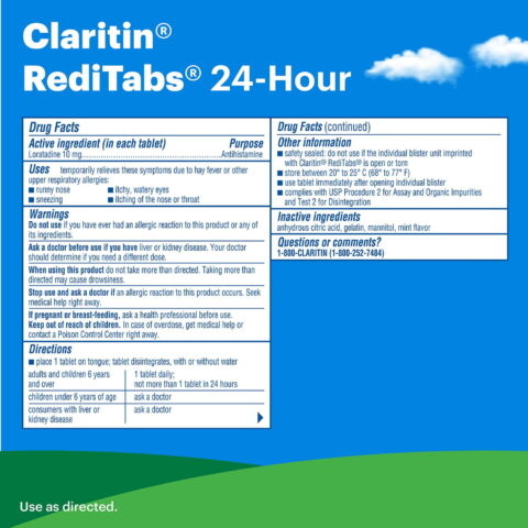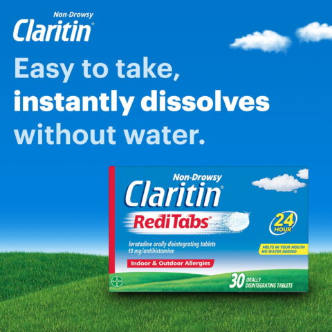 Claritin RediTabs provide powerful, 24-hour, non-drowsy relief of your worst indoor and outdoor allergy symptoms, including sneezing, runny nose, itchy/watery eyes and itchy throat/nose. Claritin provides relief of symptoms that can be triggered by over 200 different allergens. Claritin is an antihistamine, so it hinders the cascade triggered by allergens. These are easy to take because the orally dissolvable tablet melts in your mouth and requires no water. The RediTabs are for adults and children ages 6+. One tablet contains 10 mg of loratadine.