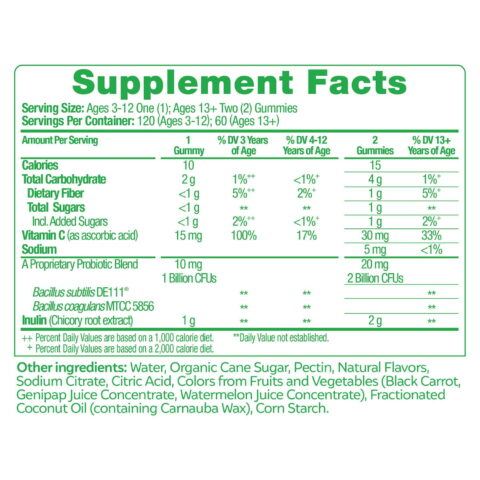 Culturelle Gummies are made with pectin, natural flavors, and colors from fruits and vegetables. They are vegan and extremely delicious; no sugary coating needed. Plus, they contain nourishing prebiotics and a boost of vitamin C. They are safe for the whole family. You can rest easy knowing you are supplementing your health with a carefully created gummy, by the makers of Culturelle.