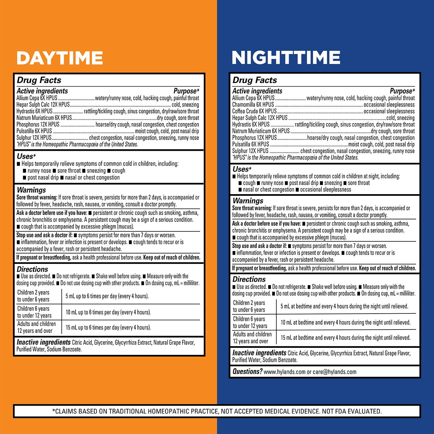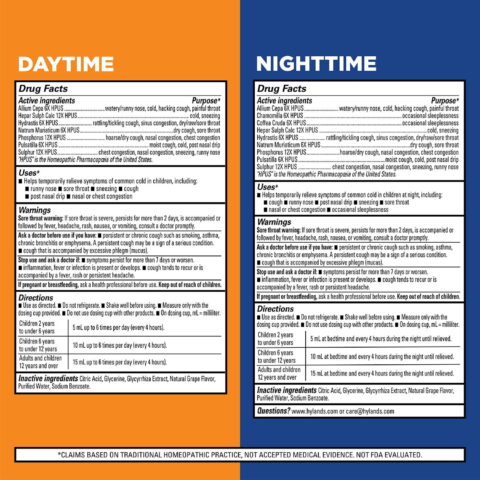The Hyland’s Kids Cold & Cough Daytime and Nighttime Combo is free from alcohol, sugar, parabens, and dyes. Made with gentle, natural active ingredients, these products are a safe and considerate choice for your child’s body. Please be aware that these claims are based on traditional homeopathic practices and have not been evaluated by the FDA.